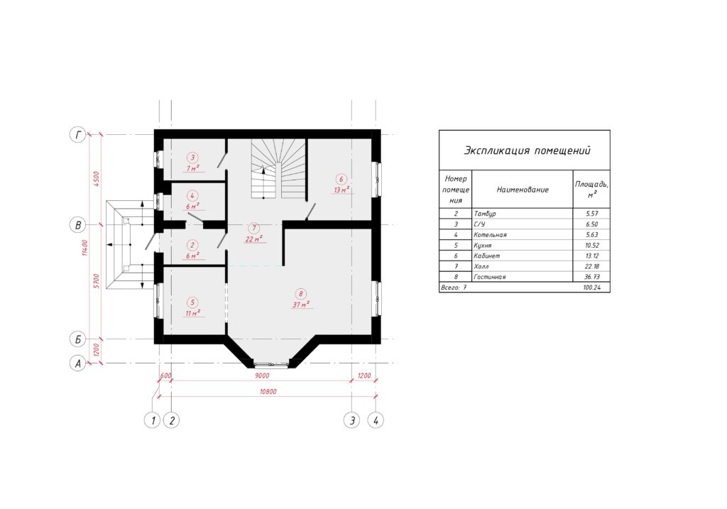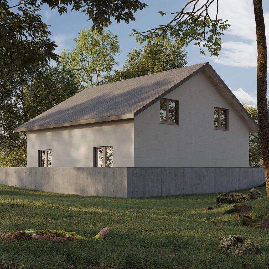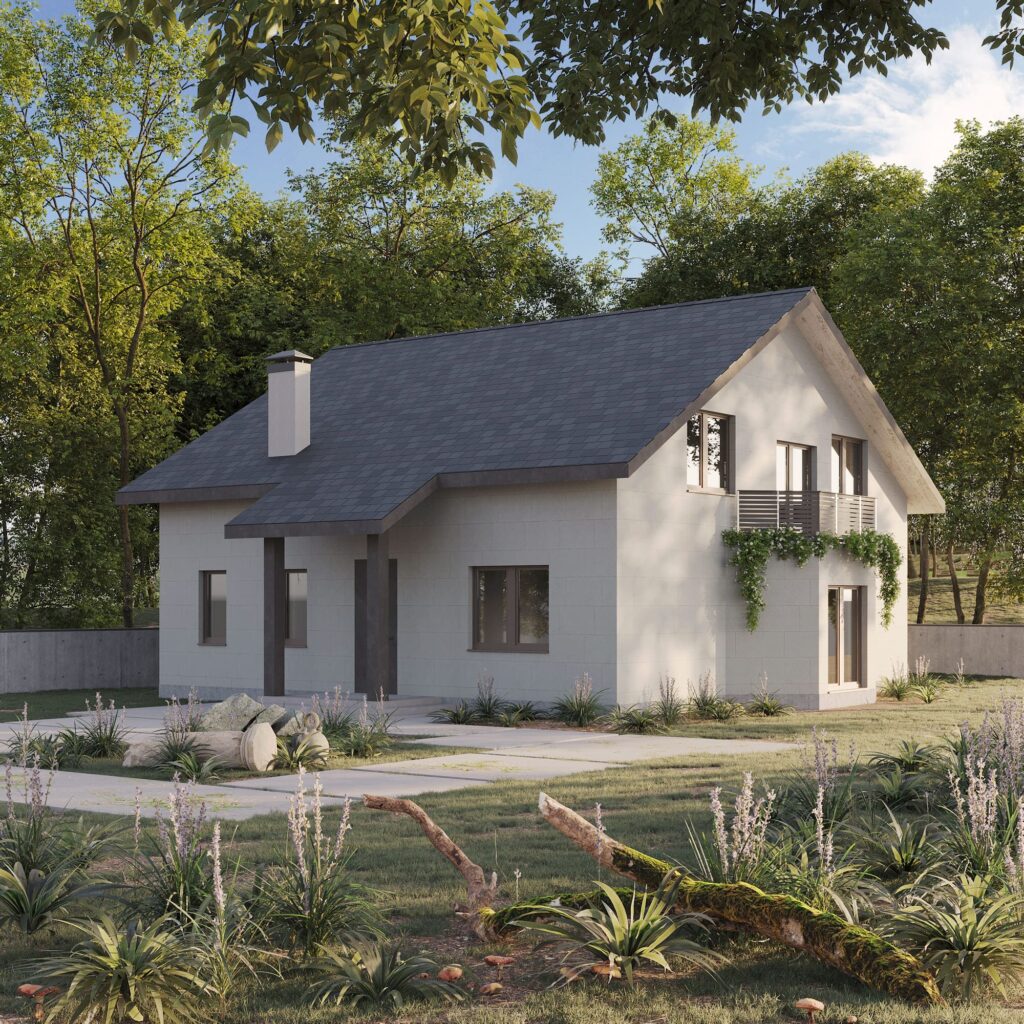 Уютный дом из газосиликата выглядит довольно компактным, но с комфортом вмещает семью из 4-5 человек. Фасад дома выполнен в спокойных бежево-серых цветах. Коттедж включает в себя один полноценный этаж и мансарду под двускатной крышей. На первом этаже площадью 100 м2 располагается холл с лестницей, который ведет в отдельный рабочий кабинет, санузел и хозяйственное помещение. Одним из пожеланий клиента была планировка дома, включающая просторную гостиную для сбора домочадцев и приема гостей. Под нее отведена большая часть первого этажа. Кухня не изолирована стеной, но находится в углу дома и визуально отделена от гостиной.