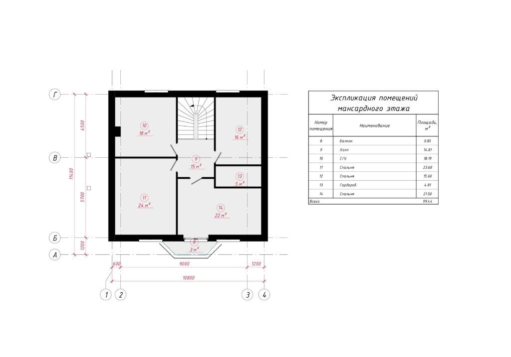 Для увеличения полезной площади дома было решено утеплить мансарду и превратить ее в жилое помещение. Здесь оборудованы четыре просторные спальни площадью от 16 до 24 м2. Одна комната имеет выход на небольшой неостекленный балкон, огороженный перилами.