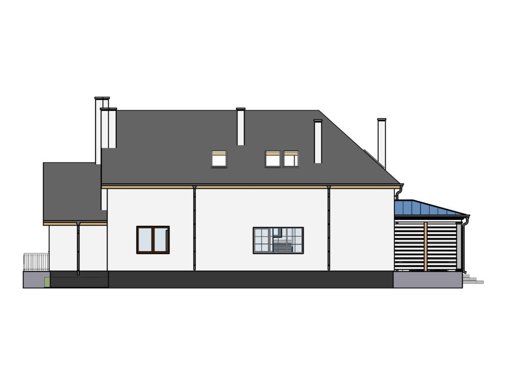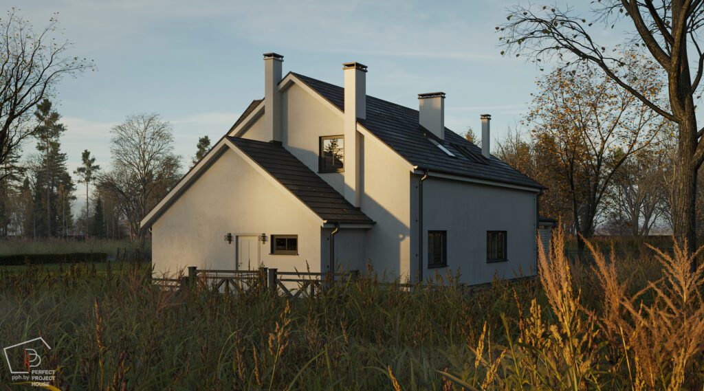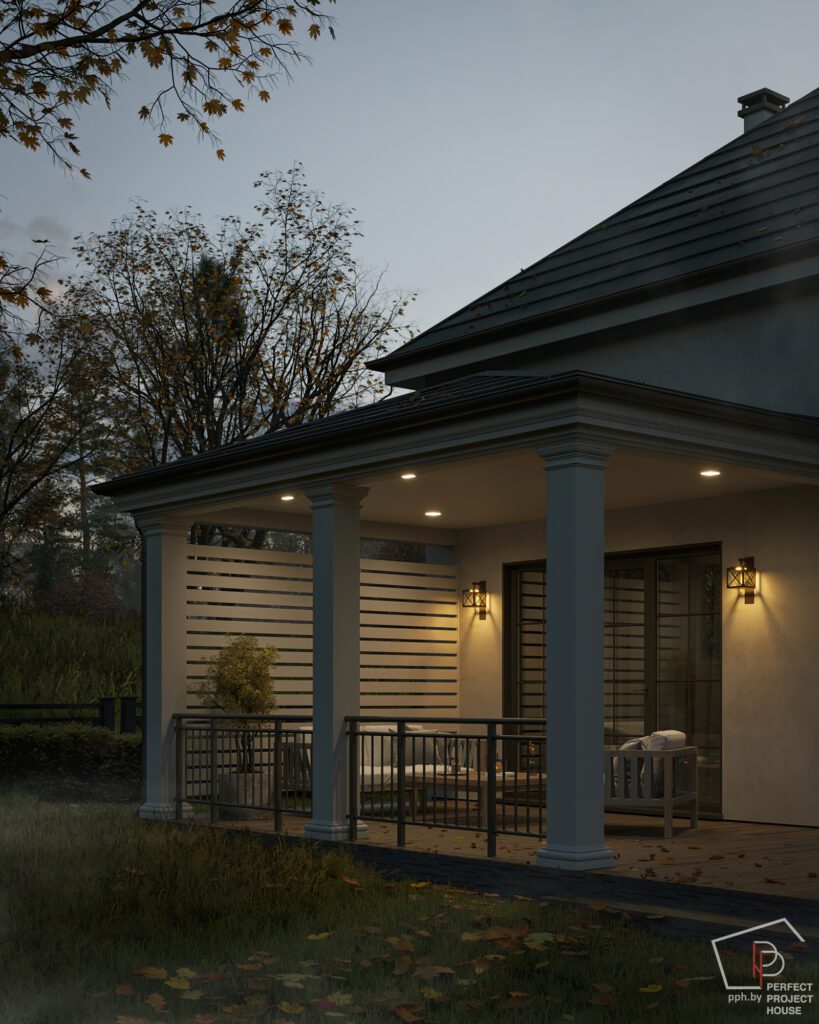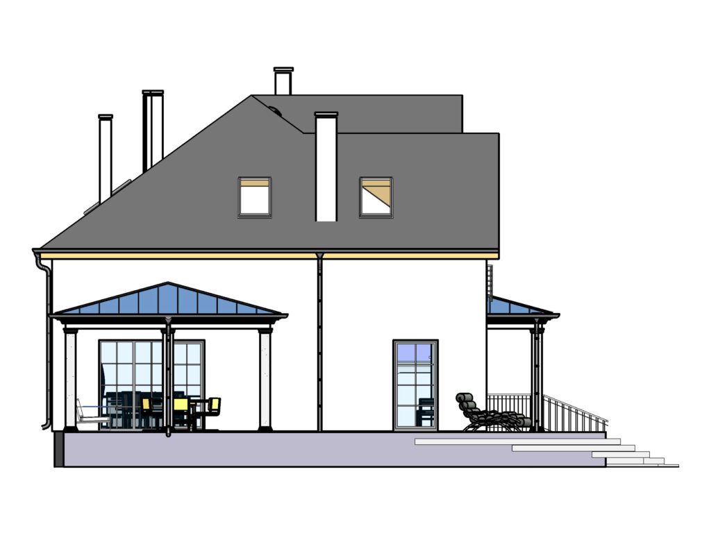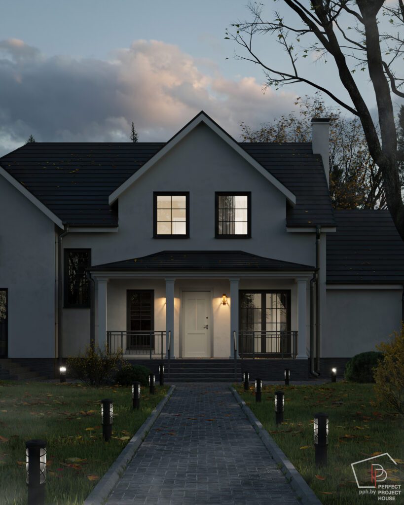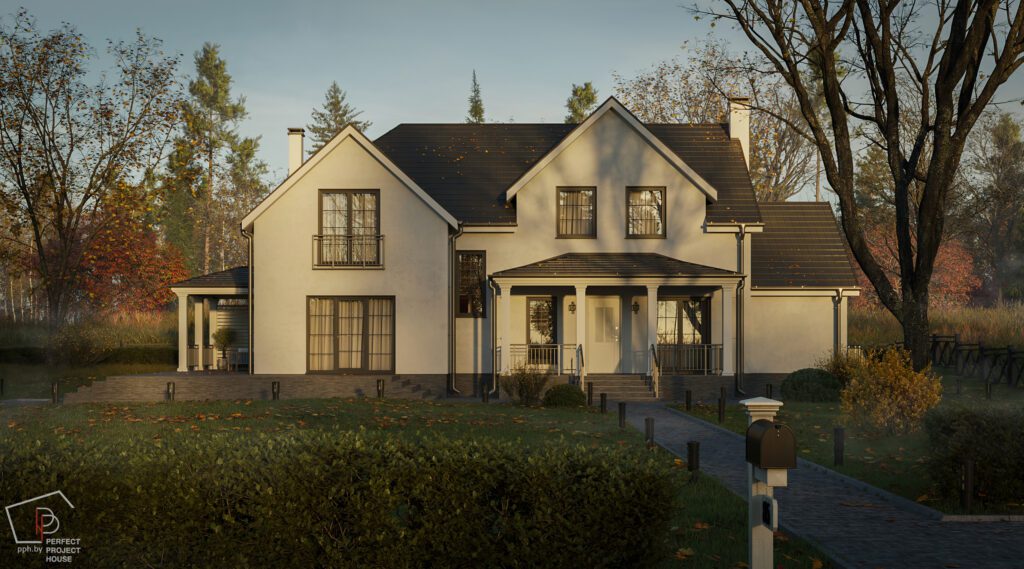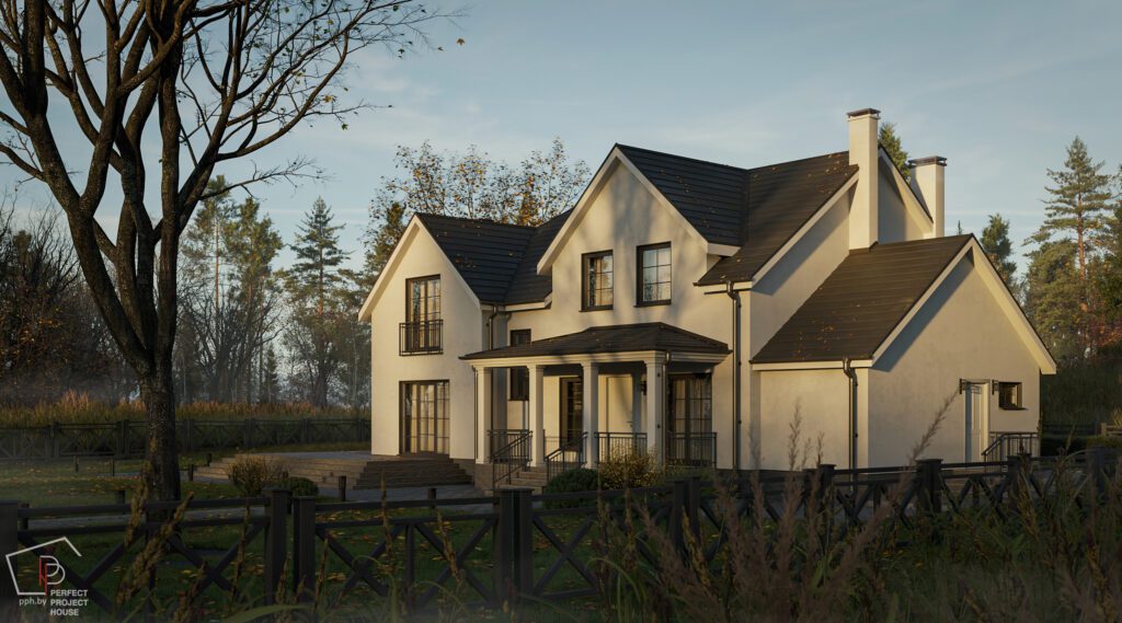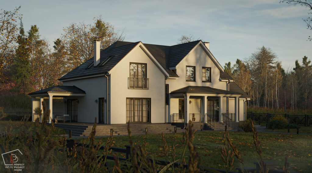 Если вам нужен оригинальный проект двухэтажного дома площадью до 270 кв. метров, обратите внимание на вариант PPHouse 250-11. Эффектное здание выполнено в духе европейских особняков. Своим внешним обликом оно напоминает роскошный дворец, который объединяет в себя многоуровневую архитектуру и просторное крыльцо с лестницей и колоннами. Особенную изюминку зданию придают французские балконы на втором этаже и панорамные окна от пола до потока, которые впускают внутрь обилие солнечного света.