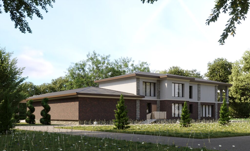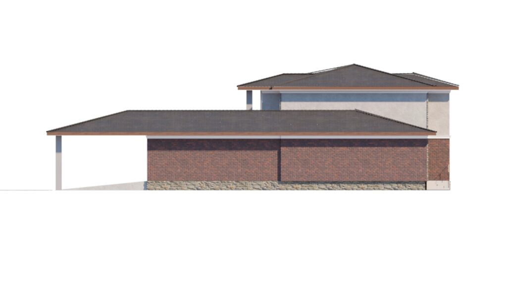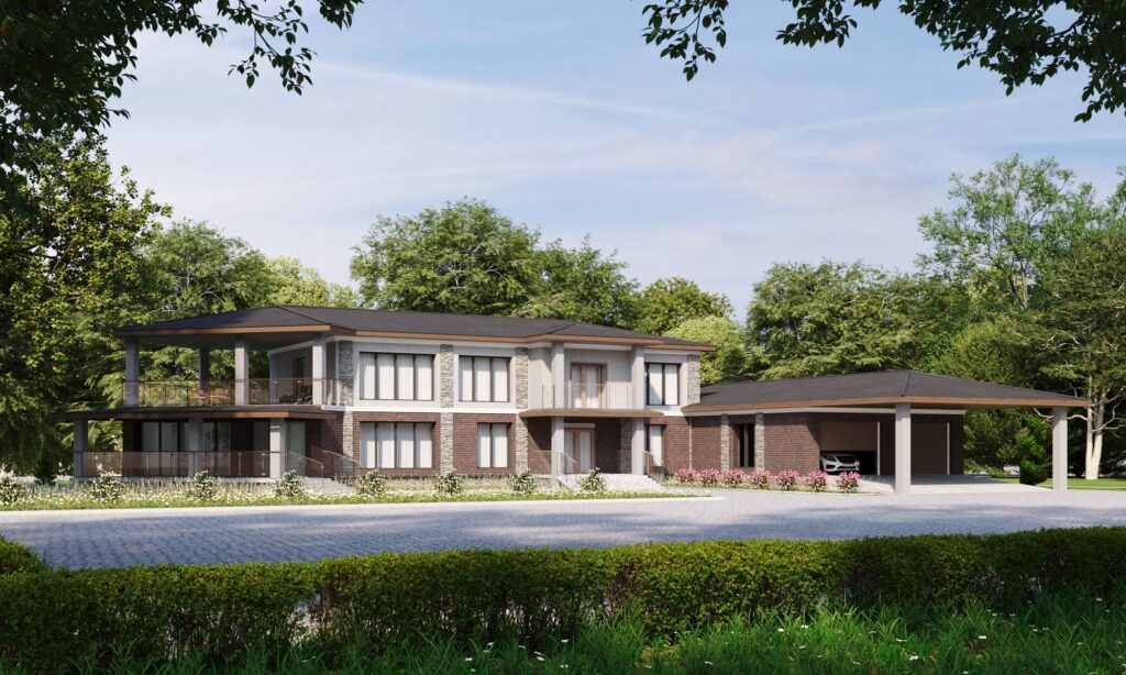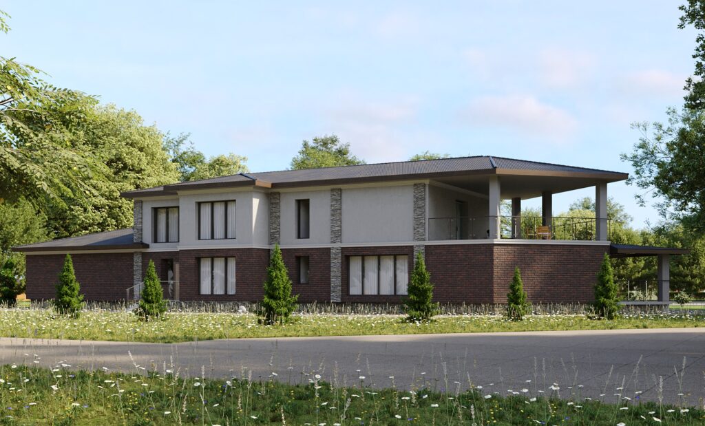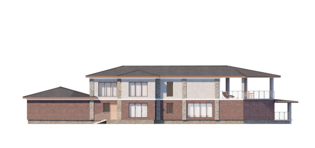 Двухэтажный дом с фасадом бело-коричневого цвета построен из кирпича. Общая площадь – чуть более 400 м2. В коттедже с комфортом разместится большая семья и их гости. Планировка включает 8 жилых комнат и 4 санузла.