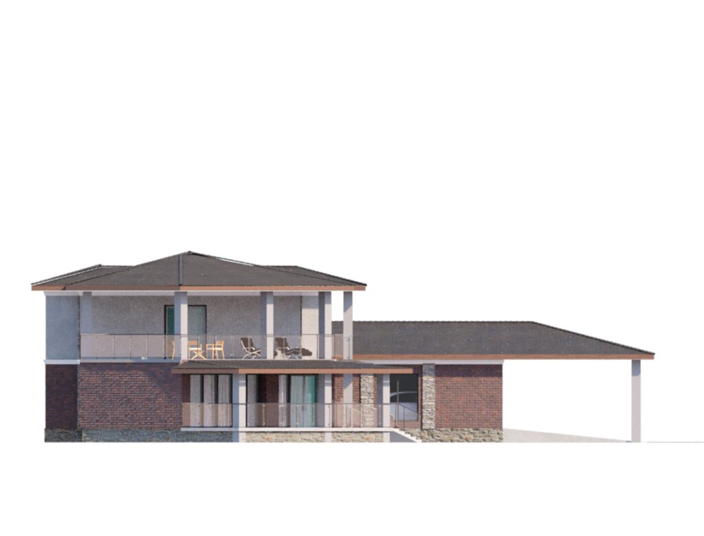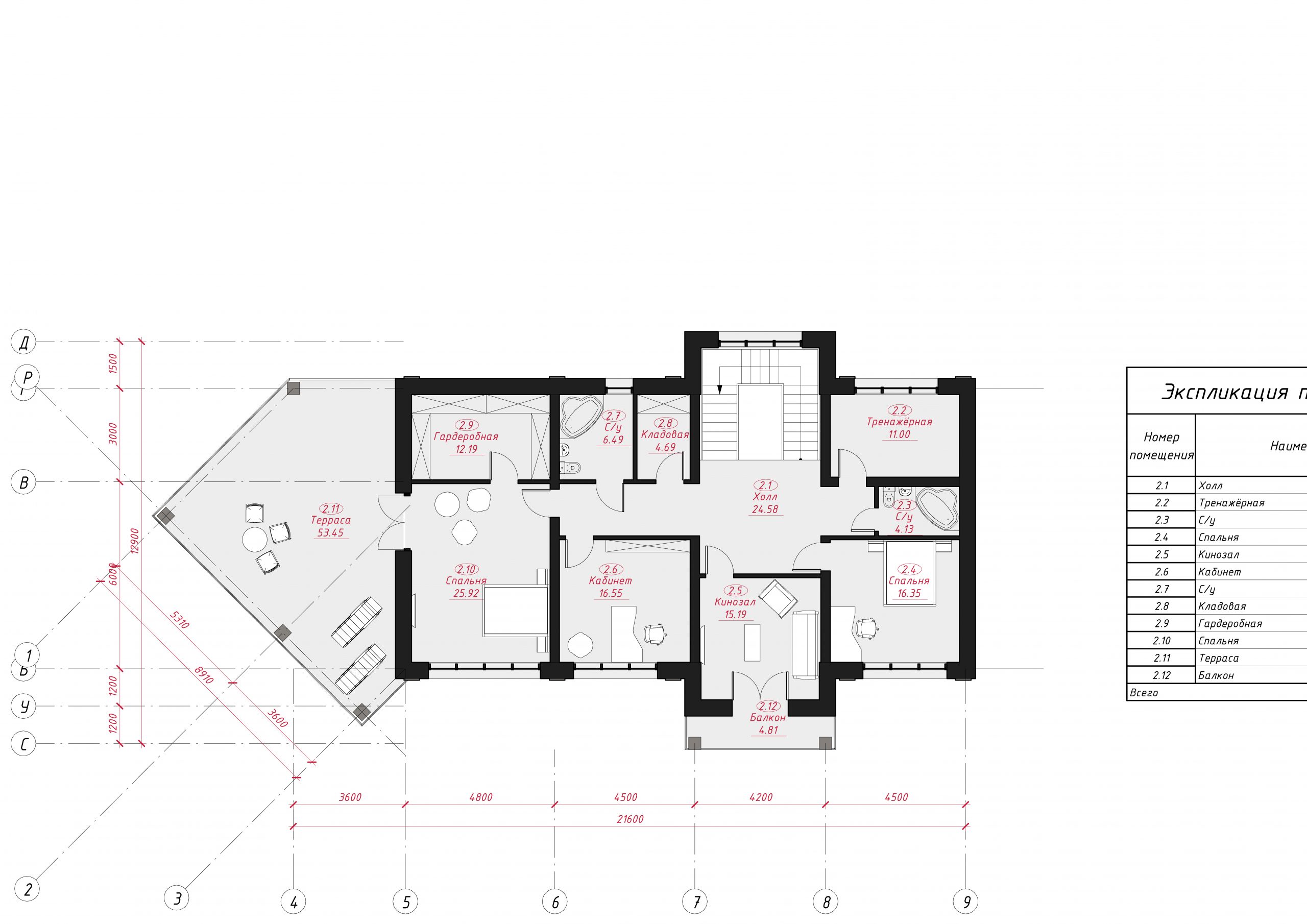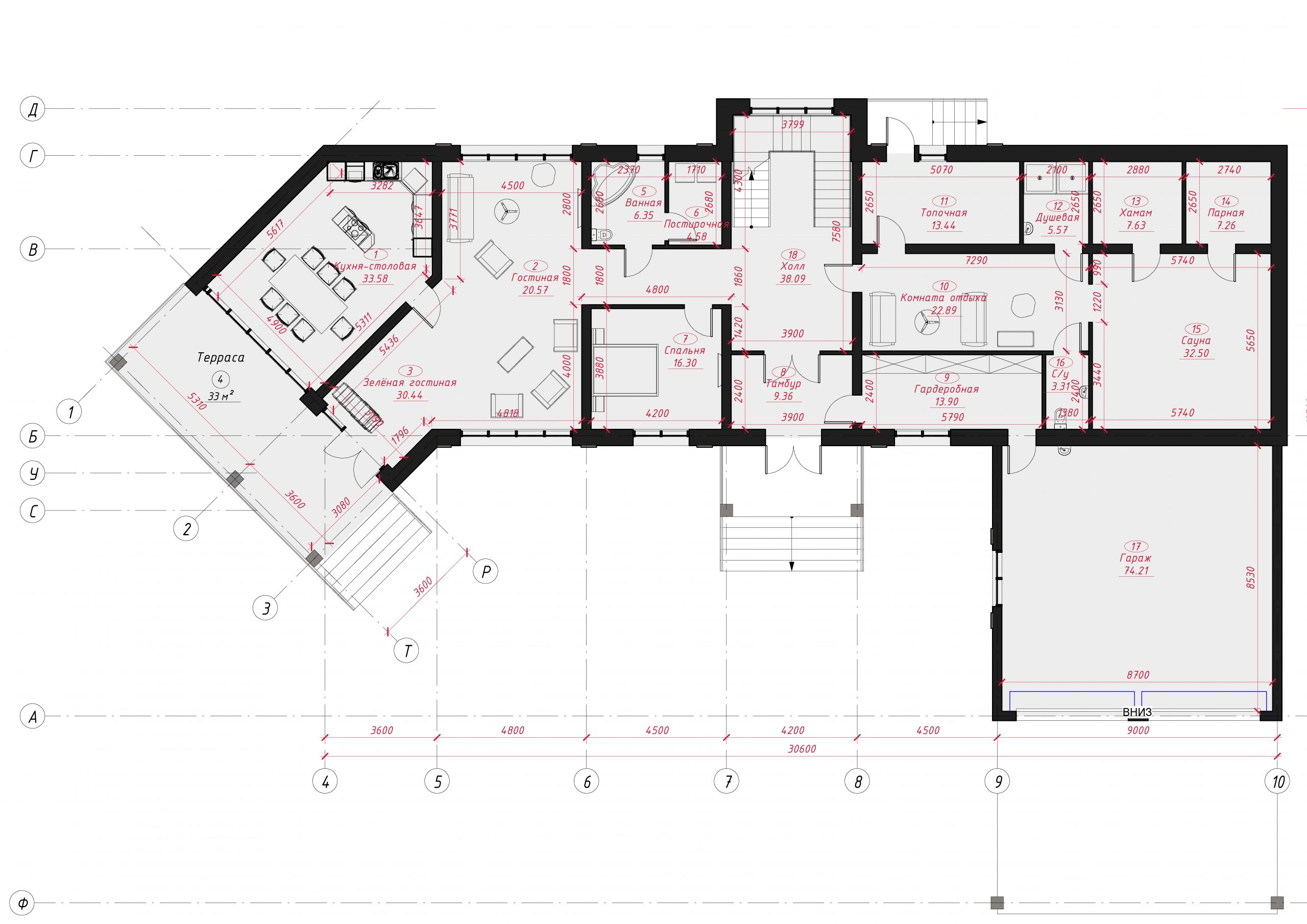 Правая часть первого этажа отведена под зону рекреации. Здесь обустроены парная, хаммам, просторная сауна, из которую попадаешь в комнату отдыха. Левая часть включает спальню, кухню-столовую и гостиную с выходом на открытую вместительную террасу. На втором этаже располагается тренажерная комната, два санузла, кладовая, кабинет, гардеробная и две спальни, одна из которых ведет на террасу. Комната с выходом на балкон отведена под домашний кинотеатр.