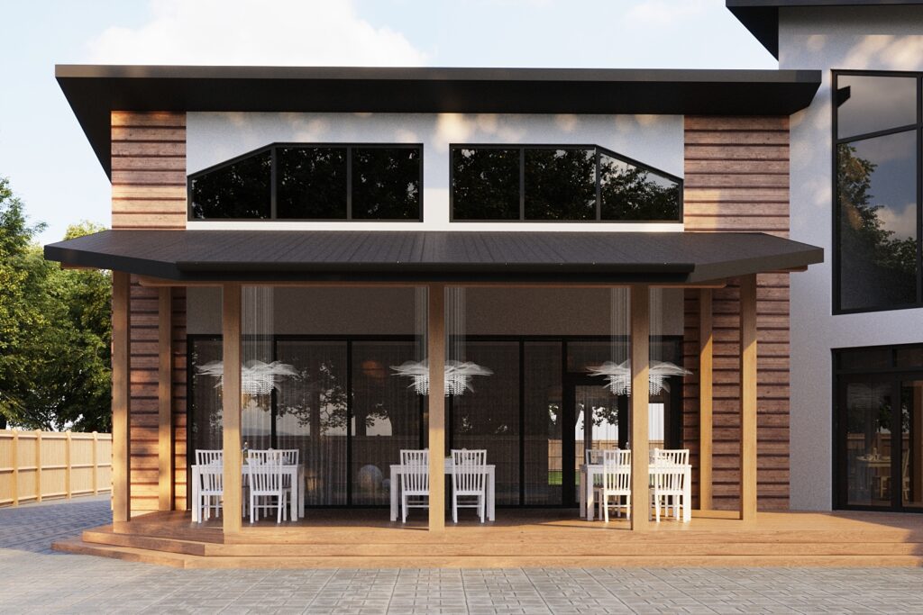 Фасад здания облицован светло-бежевым материалом, который удачно гармонирует с белоснежными вставками и темной крышей. Из панорамных окон открывается потрясающий вид на обустроенный участок, а изюминку дому придает эркерный фасад с окнами оригинальной формы. На первом этаже располагается открытая веранда с крышей, установленной на столбах. Здесь достаточно места для ежедневных семейных встреч за ужином и проведения праздничных мероприятий с большим количеством гостей.