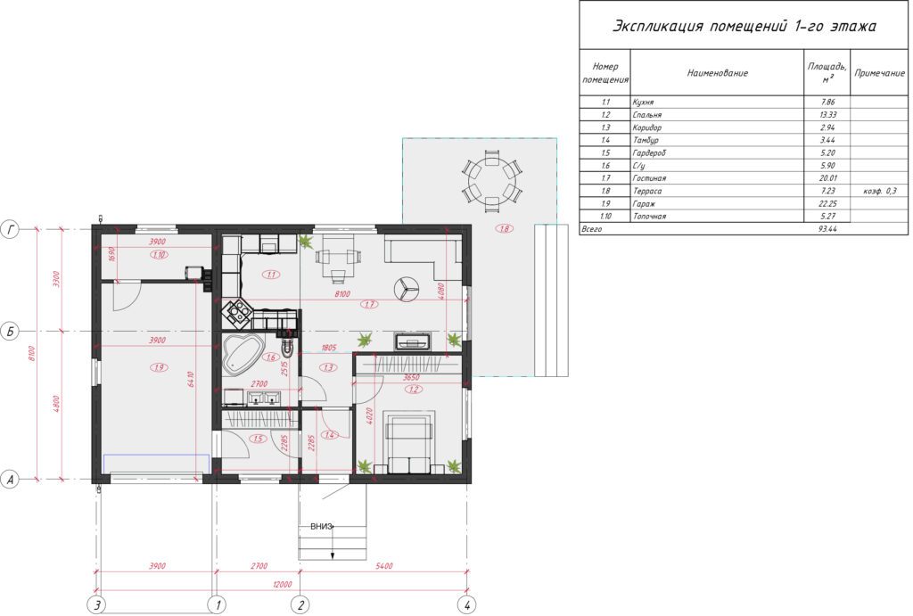 Проект PPHouse 50-12 представляет собой уютный одноэтажный дом с общей площадью 93,44 квадратных метров. Он разработан с учетом комфорта и функциональности, что делает его идеальным выбором для небольшой семьи или пары.