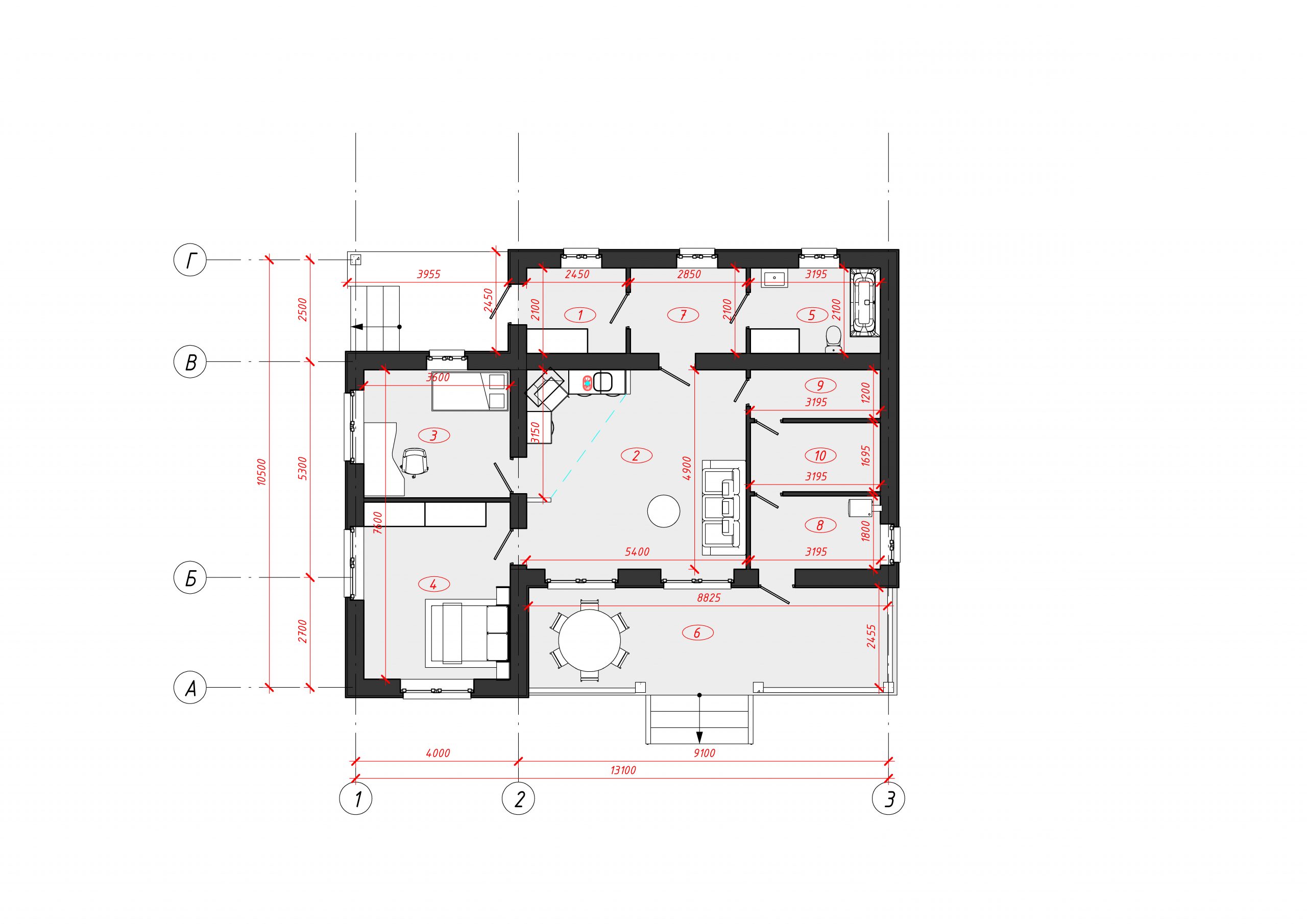 Проект представляет собой одноэтажный жилой дом с общей площадью 188,75 квадратных метров. Размеры дома составляют 10,5 метра на 13,1 метра, что обеспечивает достаточно пространства для размещения всех необходимых помещений и обеспечения комфорта проживания.