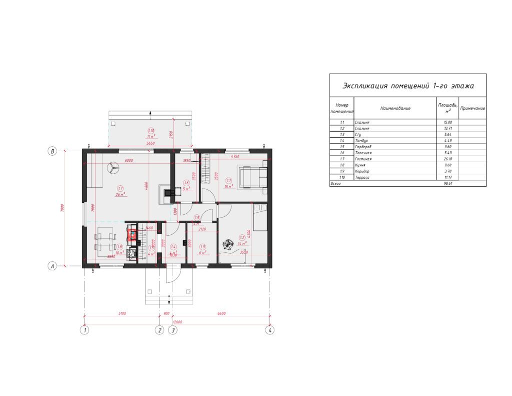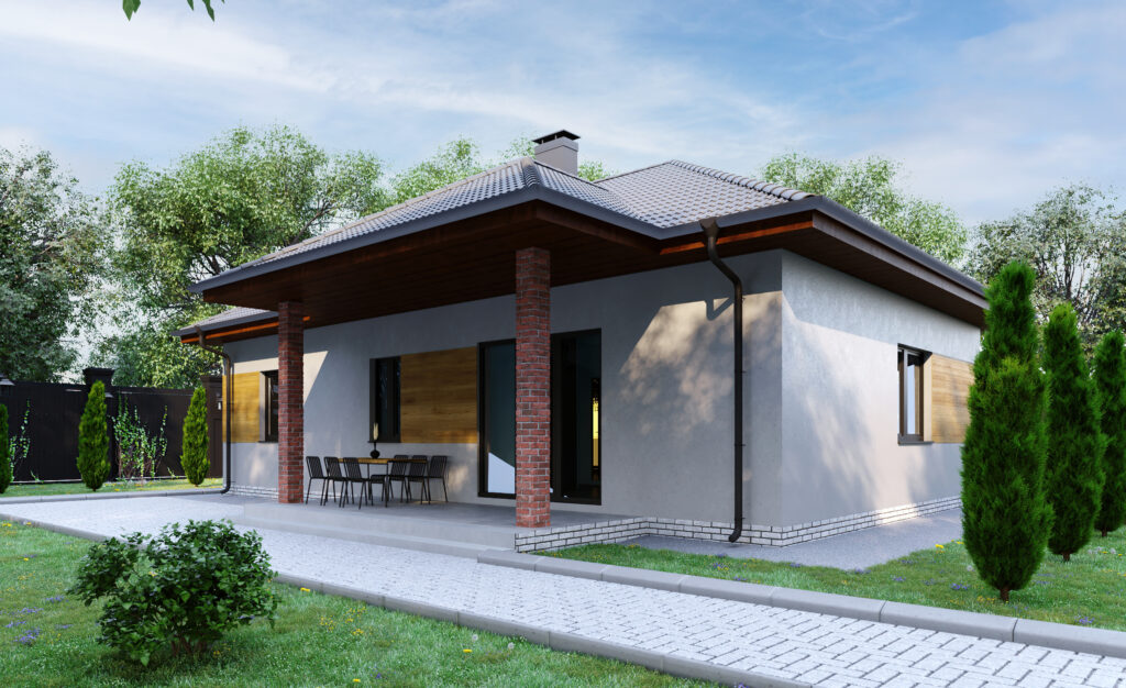 Проект дома имеет площадь 100 квадратных метров, которая включает в себя три спальни, ванную, гостиную, кухню, столовую и офис.
