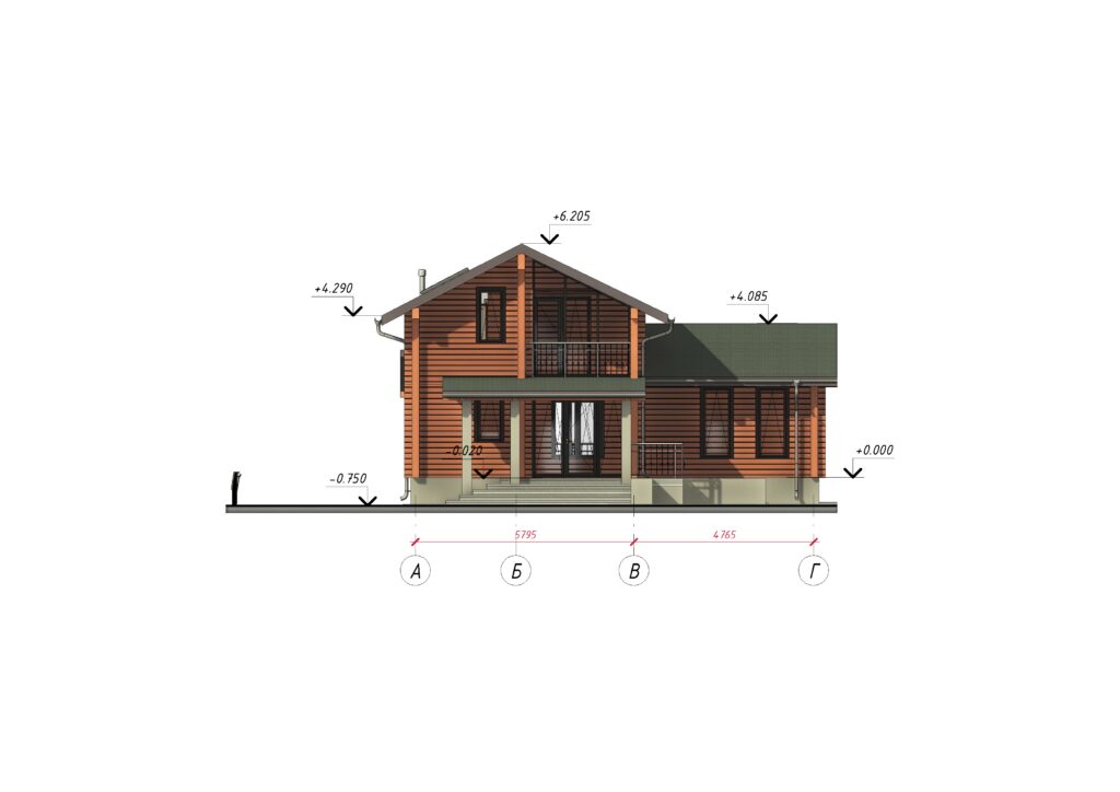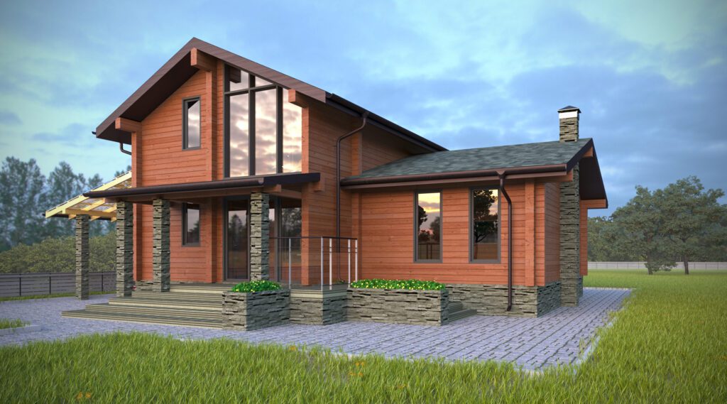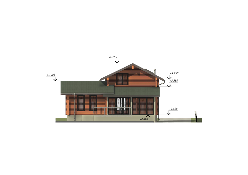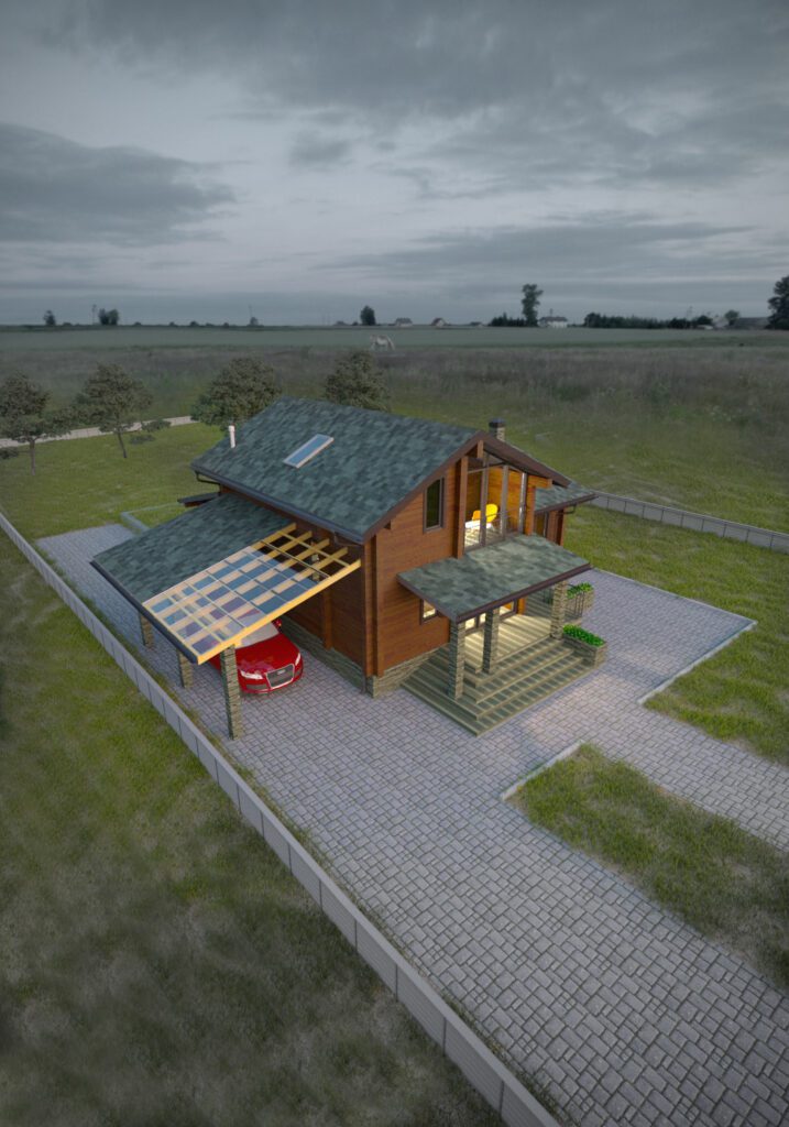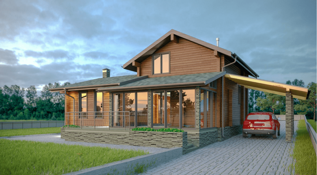 Двухэтажный коттедж общей площадью около 115 м2 возведен из качественного бруса. Было решено не строить отдельно стоящий или полностью закрытый гараж, а оборудовать зону с навесом для автомобиля. Она примыкает к дому и удачно с ним гармонирует. За счет такой планировки удалось сэкономить бюджет заказчика и реализовать оригинальное архитектурное решение. Входная группа представляет собой крыльцо с навесом, установленным на трех кирпичных столбах. Из тамбура попадаешь в просторную комнату, включающую совмещенную кухню-столовую с большим обеденным столом и гостиную. Она ведет в спальную комнату и санузел. Компактная планировка позволила выделить небольшое помещение для изолированной кладовой комнаты. Площадь второго этажа было решено сделать практически в два раза меньше и разместить здесь кабинет, отдельную гардеробную и спальню с выходом на балкон, украшенный панорамным окнами.