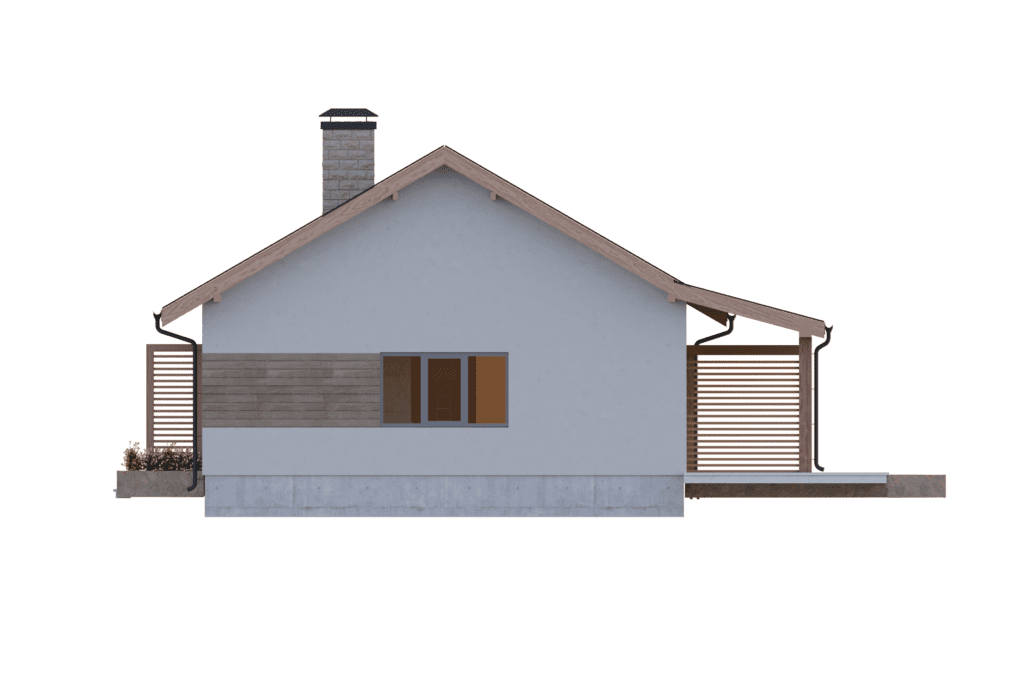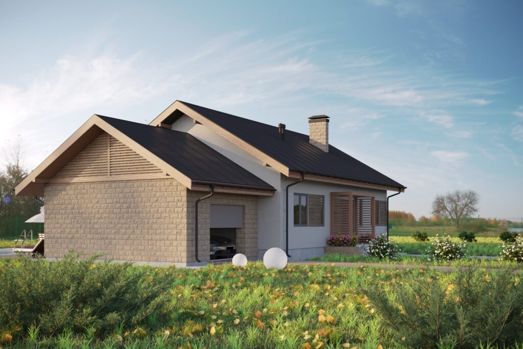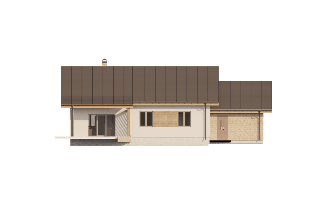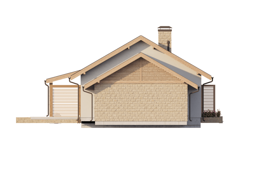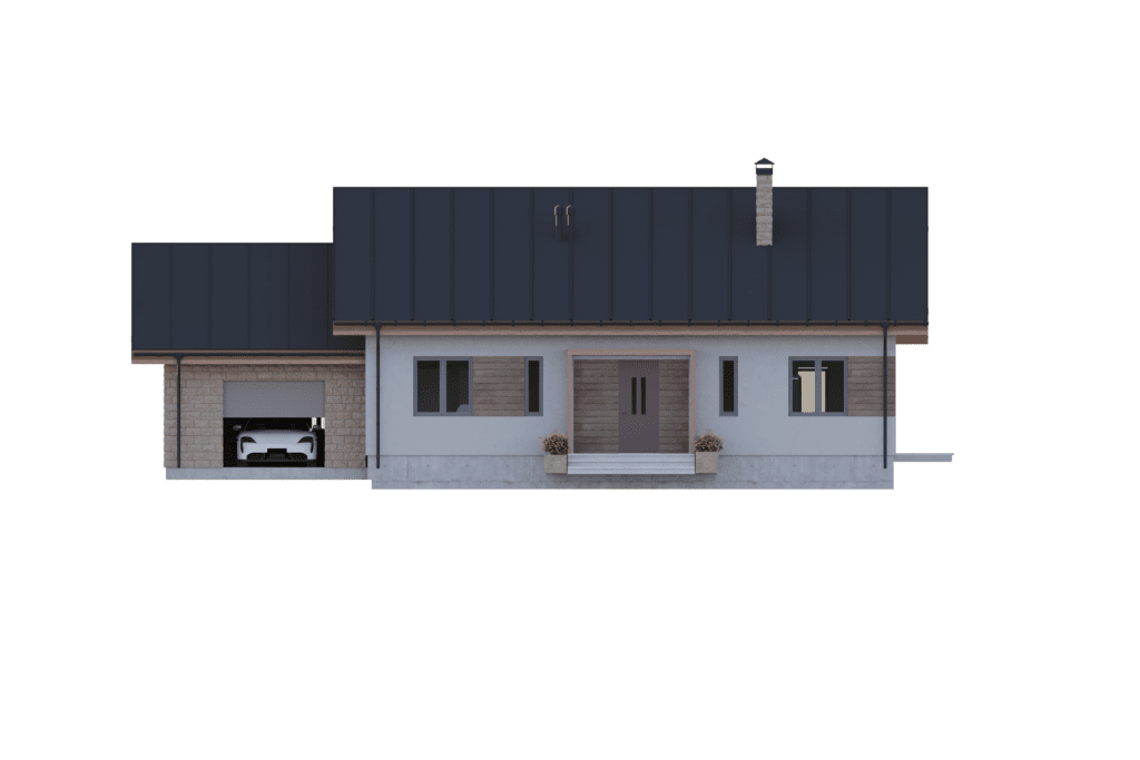 Уютный одноэтажный дом площадью более 137 м2 отлично подходит для комфортного проживания семьи из 3-4 человек. Темная двускатная крыша удачно гармонирует с белыми стенами и деревянными стеновыми панелями. Входная дверь ведет в небольшой тамбур, который переходит в холл и коридор. С левой стороны дома располагается гараж с автоматическими воротами на одно машиноместо, из которого имеется дополнительный выход на задний двор. Гараж выделяется на фоне дома за счет оригинальной облицовки стен бежевым кирпичом.