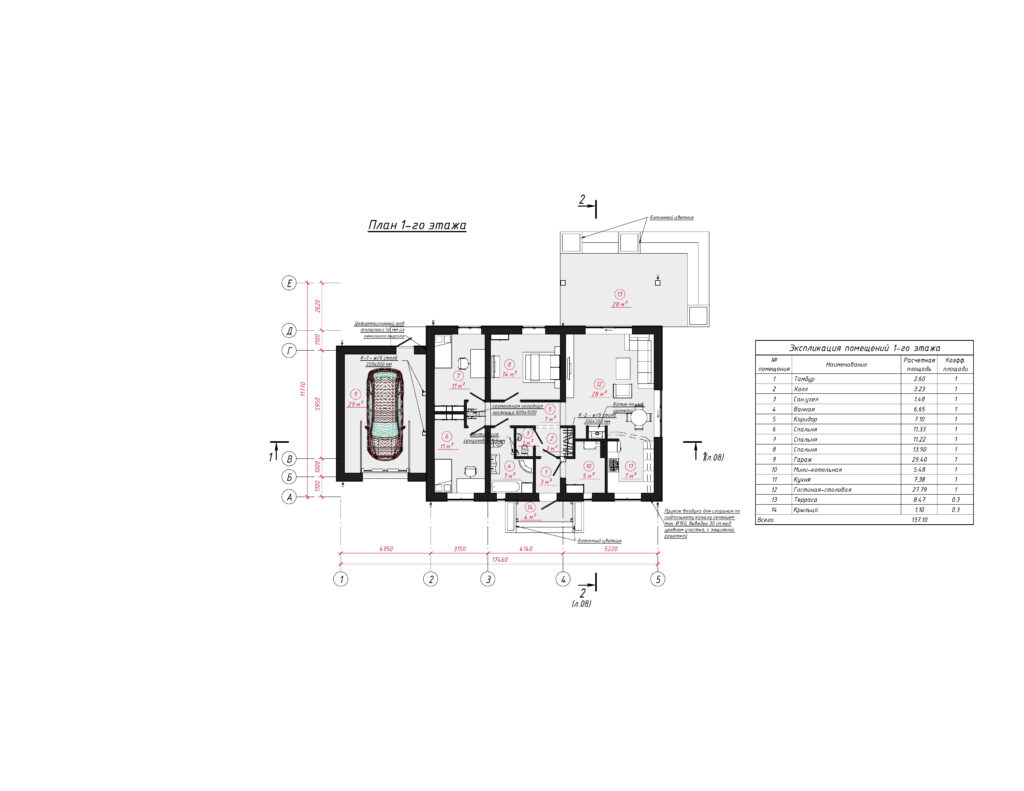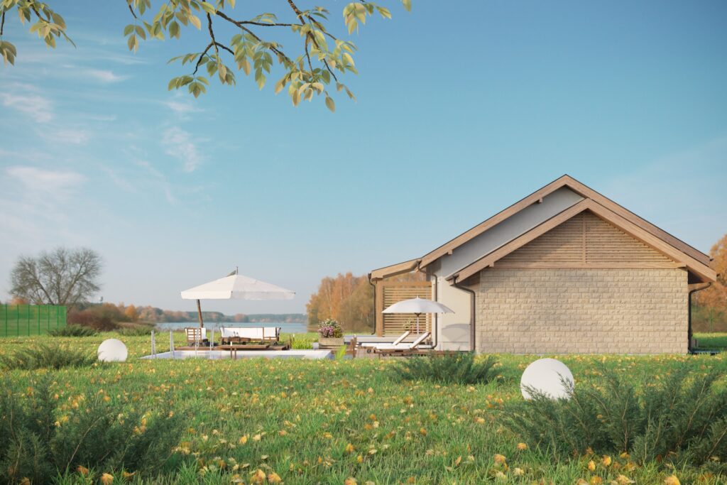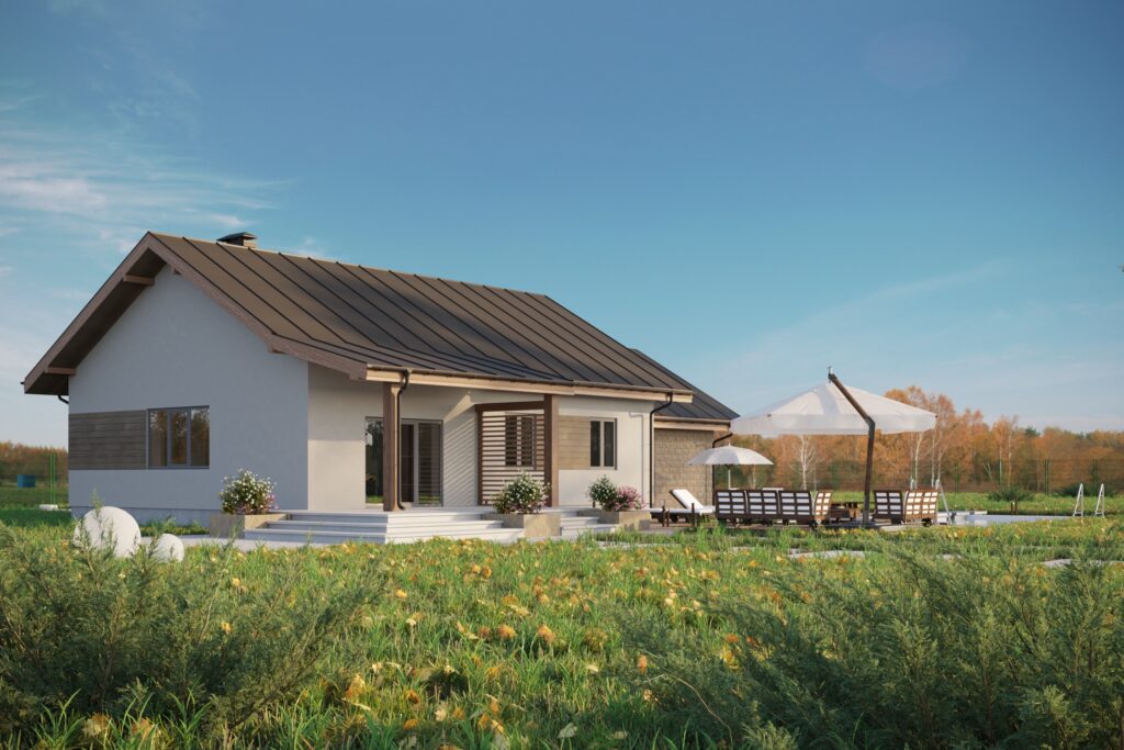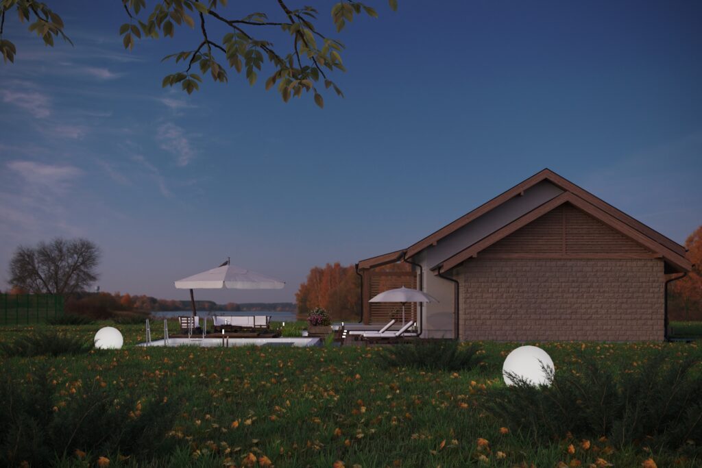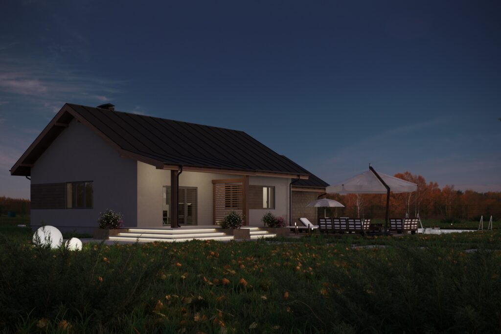 Уютный одноэтажный дом площадью более 137 м2 отлично подходит для комфортного проживания семьи из 3-4 человек. Темная двускатная крыша удачно гармонирует с белыми стенами и деревянными стеновыми панелями. Входная дверь ведет в небольшой тамбур, который переходит в холл и коридор. С левой стороны дома располагается гараж с автоматическими воротами на одно машиноместо, из которого имеется дополнительный выход на задний двор. Гараж выделяется на фоне дома за счет оригинальной облицовки стен бежевым кирпичом.