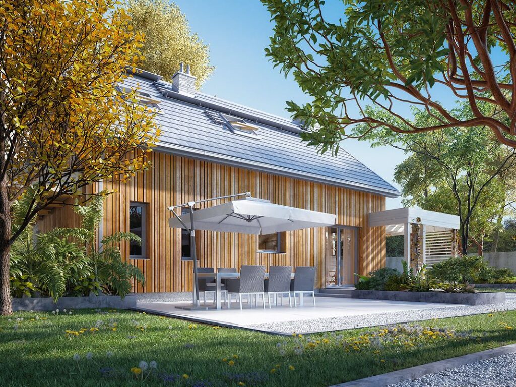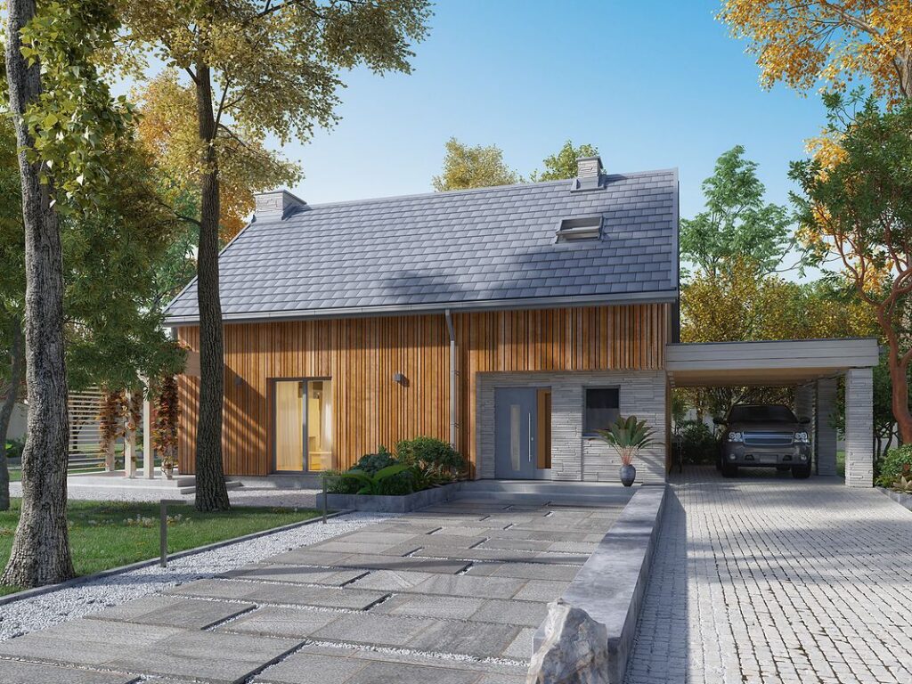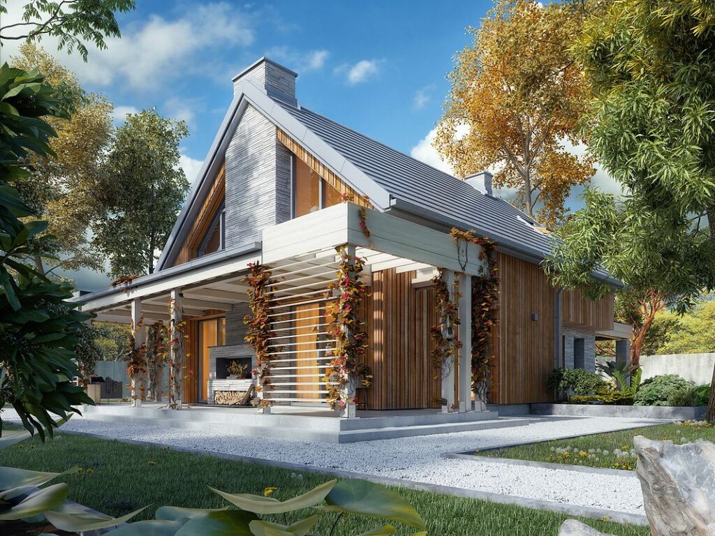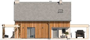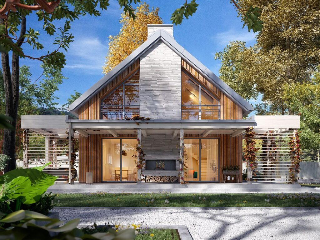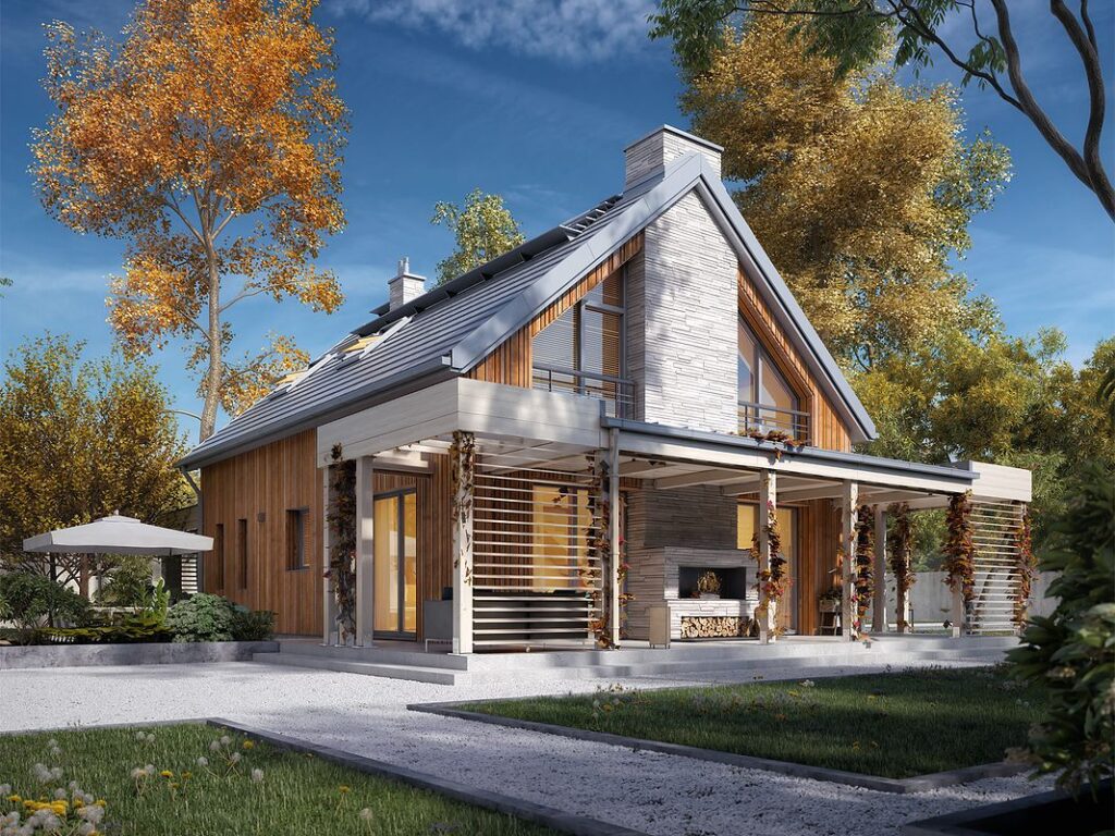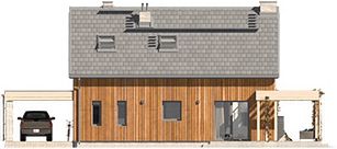 Проект двухэтажного дома площадью 116,03 м2 идеально подойдет для семьи из 3–4 человек. На первом этаже здания размещается продуманная дневная зона, которая включает в себя просторную кухню-гостиную, санузел и гардеробную. Второй уровень представляет собой полезную мансарду под скатной крышей с выделенной ночной зоной. К услугам жильцов – ванная комната и четыре комфортные спальни, в том числе две с выходом на балкон. В визуальном облике дома преобладают скандинавские мотивы. Отделка фасадов из камня и дерева, просторная открытая терраса, навес для автомобиля – отличительные особенности проекта.