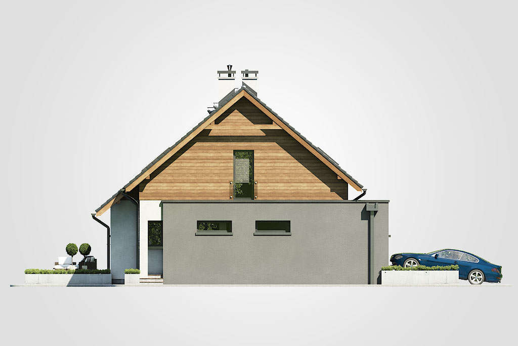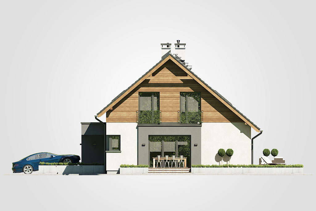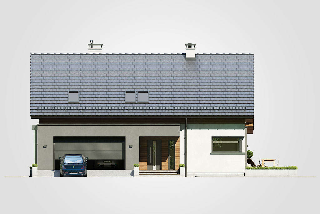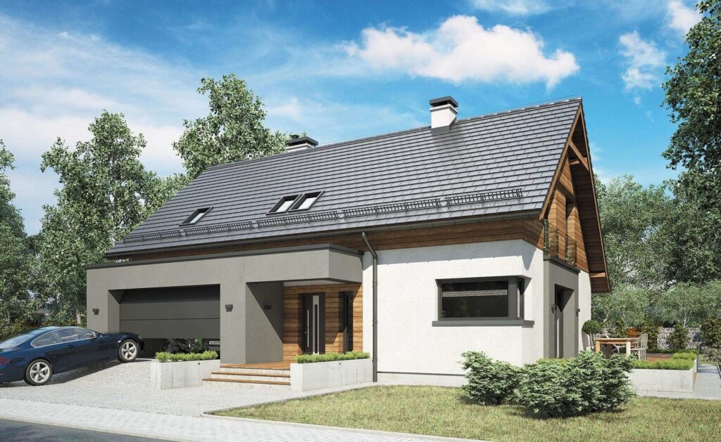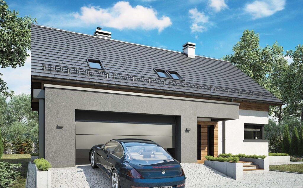 Проект дома с гаражом и чердаком можно идеально подойдет семье из 4 человек. В планировке предусмотрено всё, что необходимо современному человеку. Первый этаж занимают кухня-гостиная с выходом на террасу, кабинет, гараж на два автомобиля, два санузла. Также в проекте имеется антресоль, которую можно использовать под домашнюю библиотеку. Второй этаж – мансардный, с тремя спальнями, двумя санузлами и дополнительной комнатой. Два помещения чердака имеют выходы на миниатюрные французские балконы. Визуально здание отличается оригинальной архитектурой и станет прекрасным выбором для ценителей нетривиальных решений.