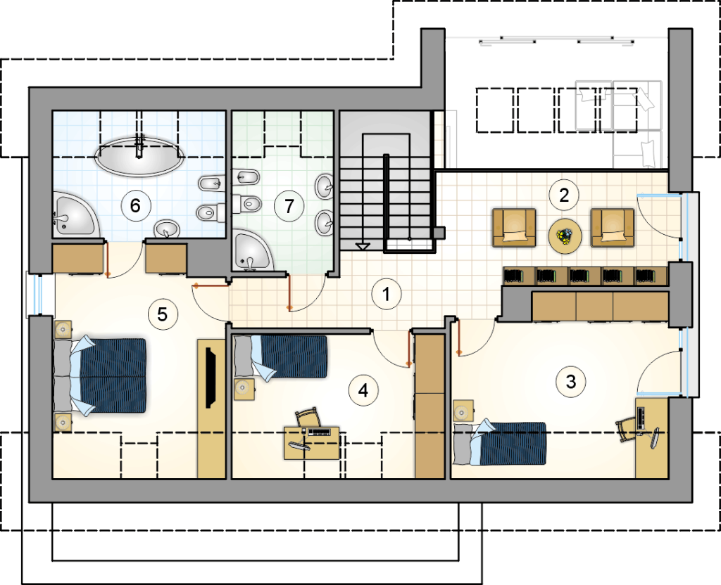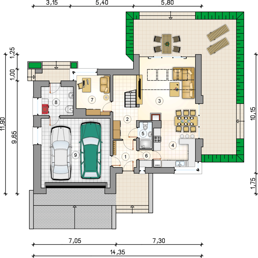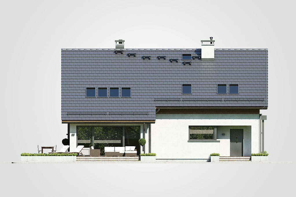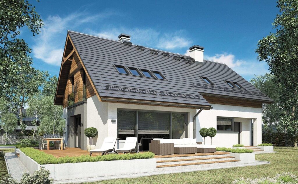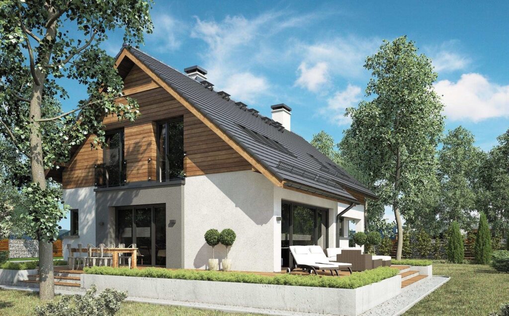 Проект дома с гаражом и чердаком можно идеально подойдет семье из 4 человек. В планировке предусмотрено всё, что необходимо современному человеку. Первый этаж занимают кухня-гостиная с выходом на террасу, кабинет, гараж на два автомобиля, два санузла. Также в проекте имеется антресоль, которую можно использовать под домашнюю библиотеку. Второй этаж – мансардный, с тремя спальнями, двумя санузлами и дополнительной комнатой. Два помещения чердака имеют выходы на миниатюрные французские балконы. Визуально здание отличается оригинальной архитектурой и станет прекрасным выбором для ценителей нетривиальных решений.