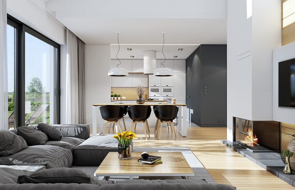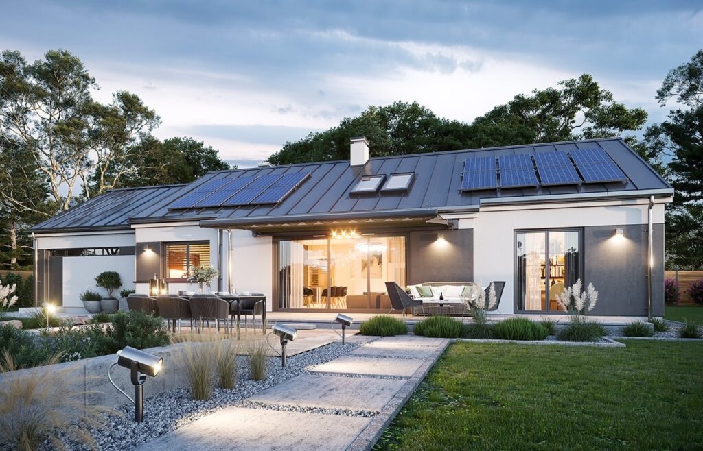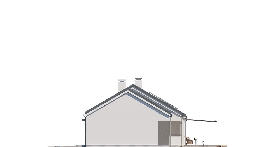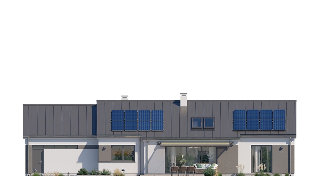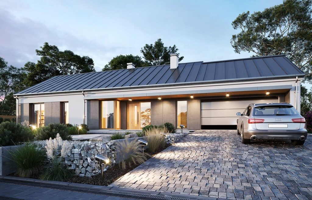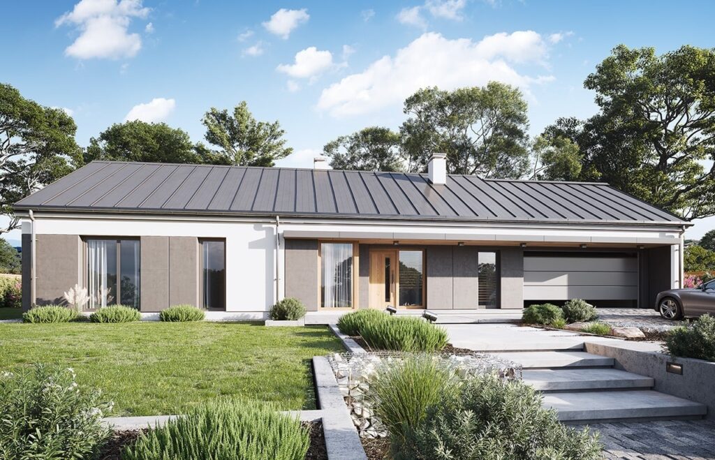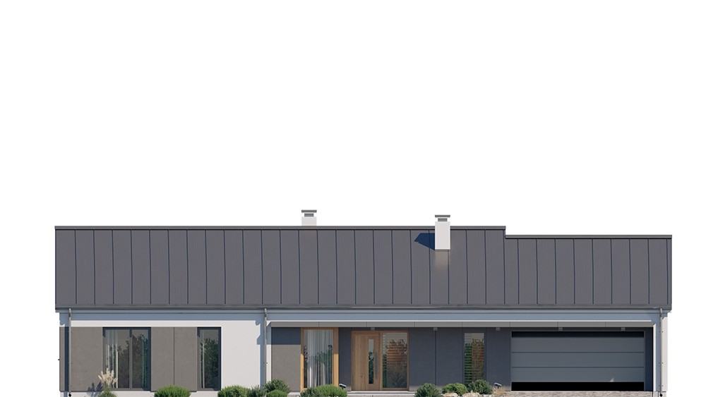 Одноэтажный загородный дом выглядит внушительно и стильно. При общей площади в 199,82 м2 он комфортно вмещает гараж на два автомобиля, а также все необходимые помещения для 3–4 членов семьи. Здание имеет прямоугольную форму с симметричной двускатной крышей и широким фасадом. Его архитектура отличается обилием остекления, сочетанием светлых и темных оттенков стен, что придает постройке эффектный и гармоничный вид. Над входной зоной располагается удлиненный козырек, перед воротами гаража оборудована удобная подъездная площадка. Внутри предусмотрена рациональная, тщательно продуманная планировка. Три спальни, большая кухня-гостиная, два санузла – всё это повышает комфорт в проживании и обеспечивает уютный внутренний микроклимат. Для чаепития и отдыха домочадцев обустроена открытая терраса с двумя выходами – из гостиной и спальни.