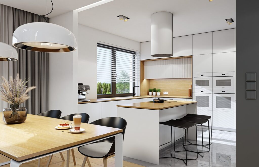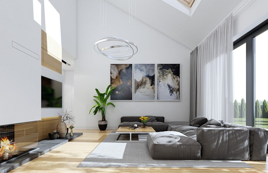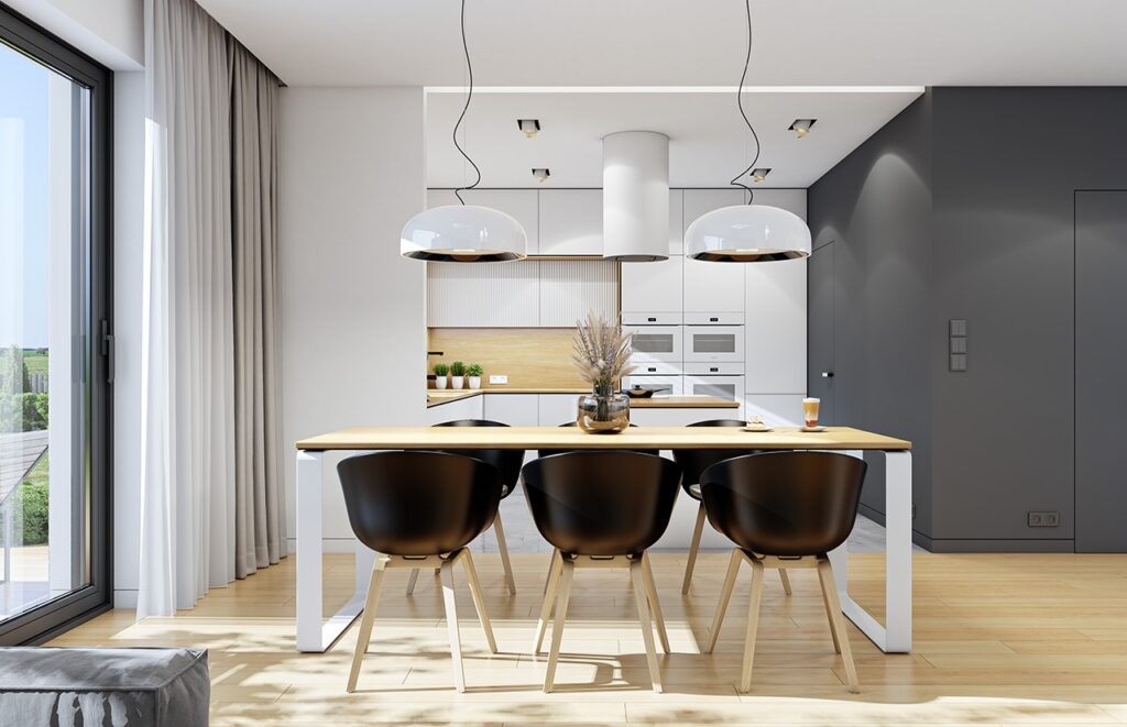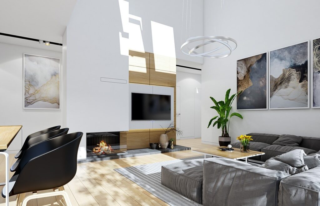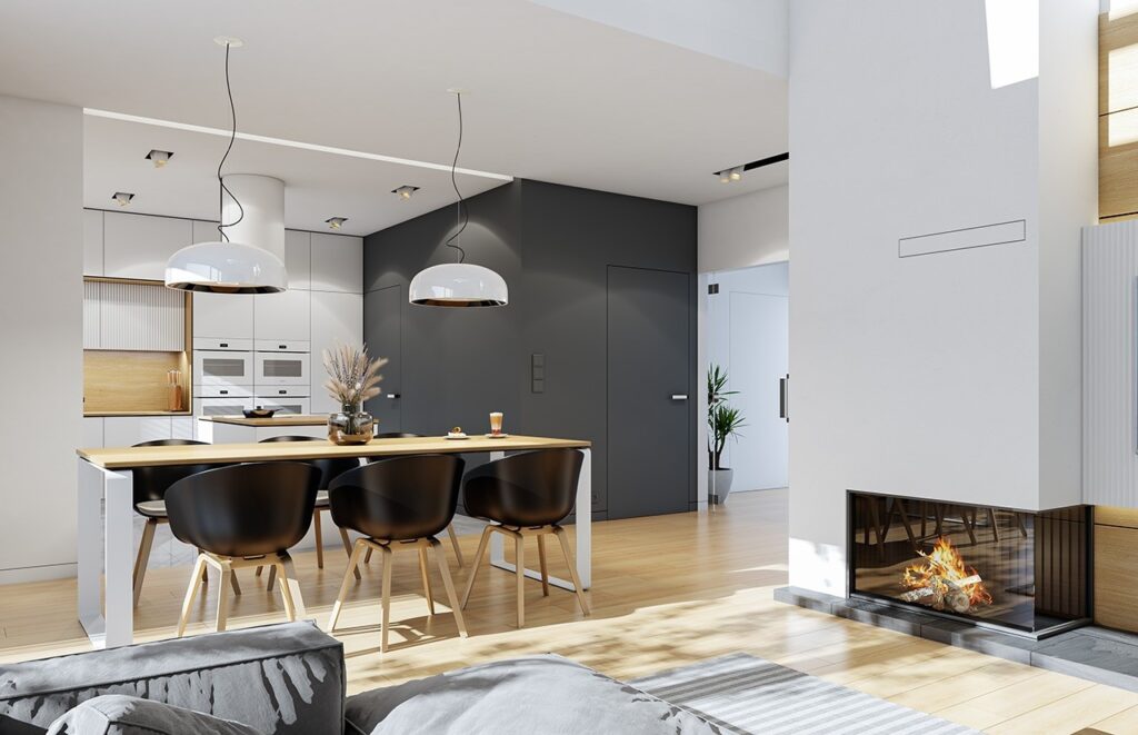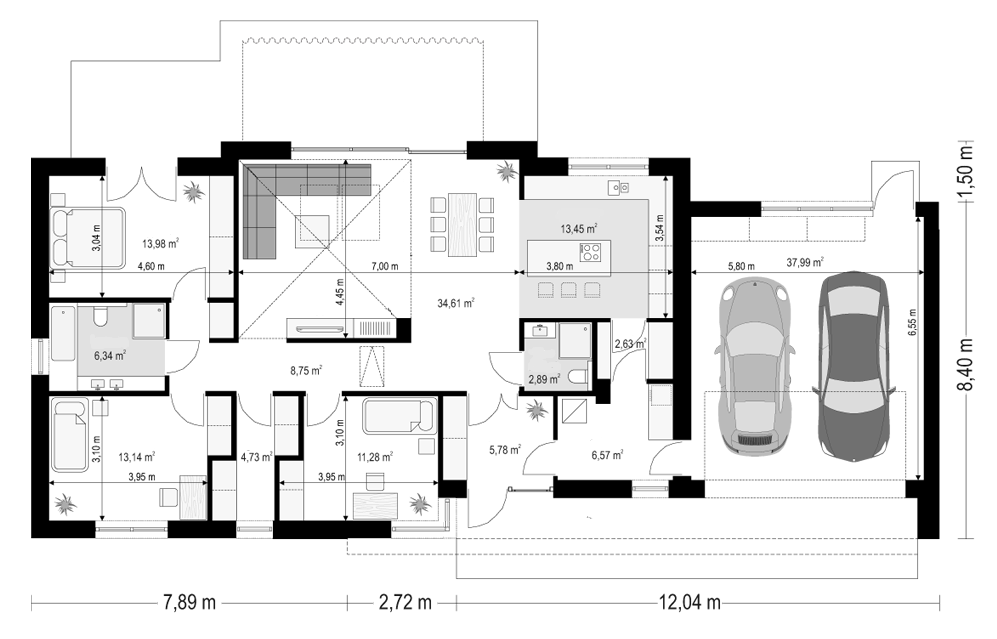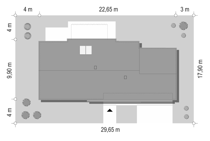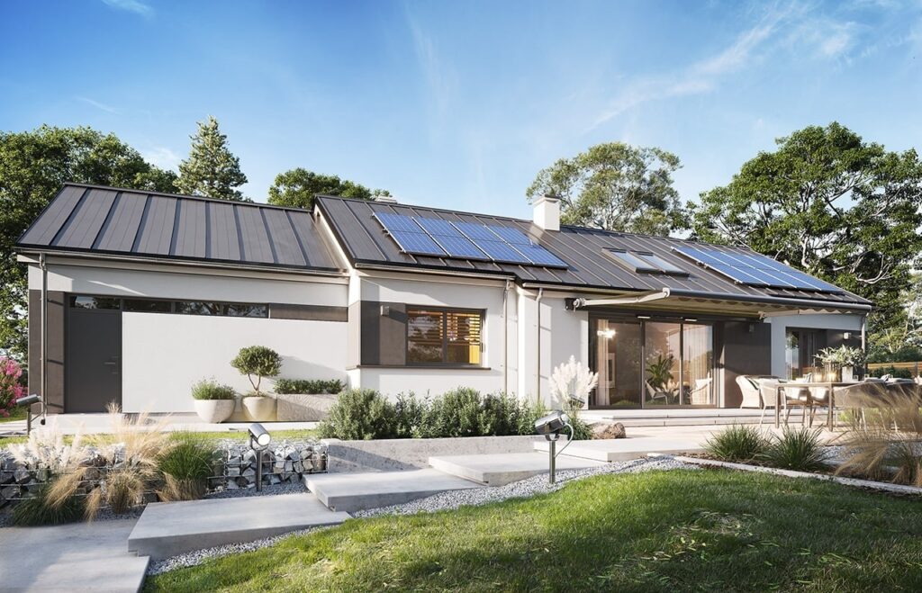 Одноэтажный загородный дом выглядит внушительно и стильно. При общей площади в 199,82 м2 он комфортно вмещает гараж на два автомобиля, а также все необходимые помещения для 3–4 членов семьи. Здание имеет прямоугольную форму с симметричной двускатной крышей и широким фасадом. Его архитектура отличается обилием остекления, сочетанием светлых и темных оттенков стен, что придает постройке эффектный и гармоничный вид. Над входной зоной располагается удлиненный козырек, перед воротами гаража оборудована удобная подъездная площадка. Внутри предусмотрена рациональная, тщательно продуманная планировка. Три спальни, большая кухня-гостиная, два санузла – всё это повышает комфорт в проживании и обеспечивает уютный внутренний микроклимат. Для чаепития и отдыха домочадцев обустроена открытая терраса с двумя выходами – из гостиной и спальни.