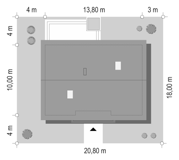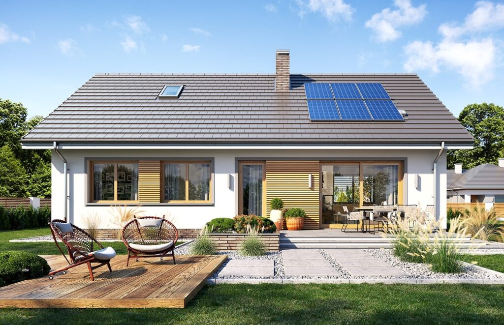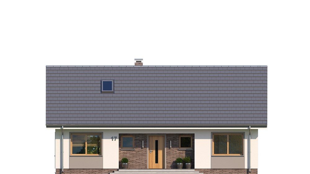 Небольшой одноэтажный дом с черепичной крышей станет уютным гнездышком для семьи из 3–4 человек. Площадь в 134,96 м2 позволяет комфортно размещать его даже на небольшом участке, используя для постоянного или сезонного проживания. Фасады здания выполнены в современном стиле – с широкими окнами, кирпичной отделкой цоколя и входной зоны. Светлые оттенки фасадов эффектно гармонируют с темной кровлей, придавая строению респектабельный вид. Все жилые помещения в доме расположены на уровне первого этажа. Планировка делит площадь постройки на две части – жилую и гостевую. К услугам домочадцев – кухня-гостиная, три просторные спальни, два санузла, гардеробная. В проекте предусмотрены два выхода на разные стороны дома – один основной на крыльцо, другой на открытую террасу. Чердачное помещение можно использовать под две дополнительных комнаты или для обустройства зоны хранения.