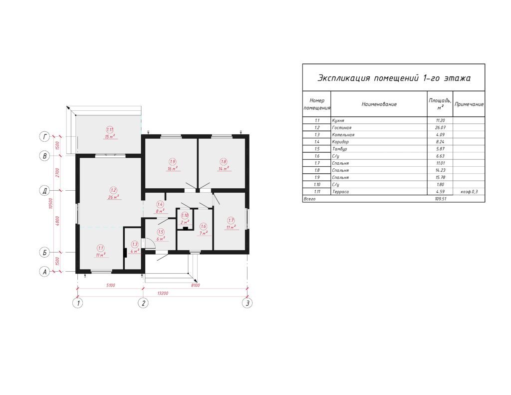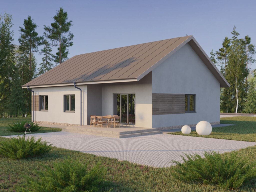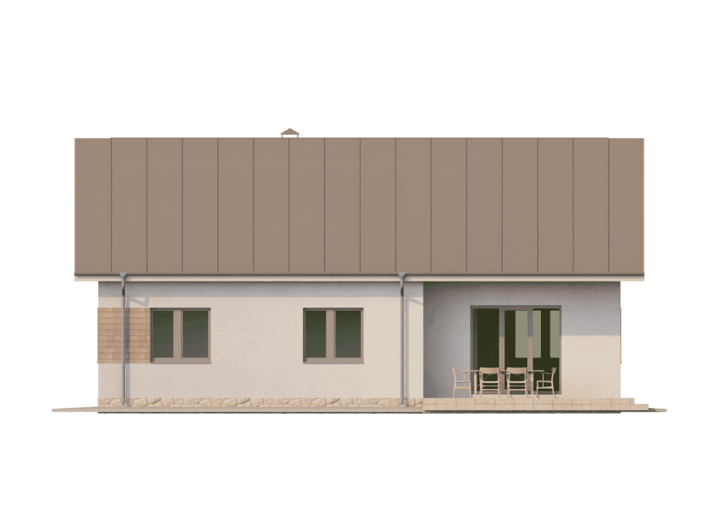Небольшой одноэтажный дом площадью около 110 м2 за счет компактной планировки станет уютным жилищем для семьи из 3-4 человек. Входная дверь ведет в тамбур и коридор, по обеим сторонам которого располагаются жилые комнаты. Самым просторным помещением стала кухня-гостиная. Она занимает практически 40 м2 и позволит собирать на семейные праздники всех родных и друзей. За счет вытянутой формы помещение будет удобно визуально разделить на две зоны.