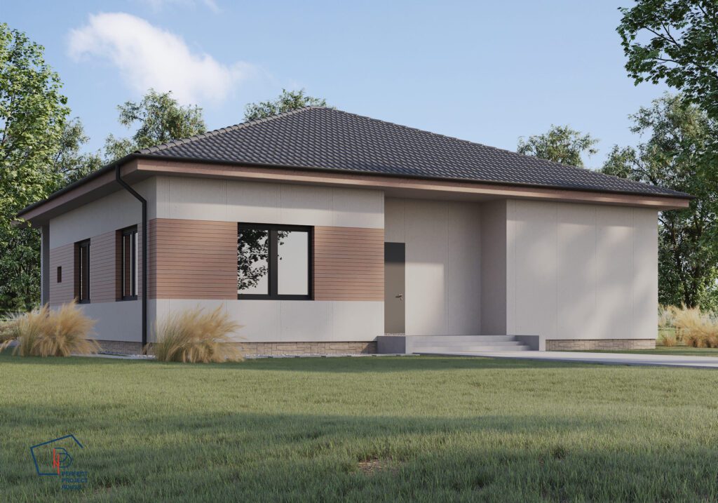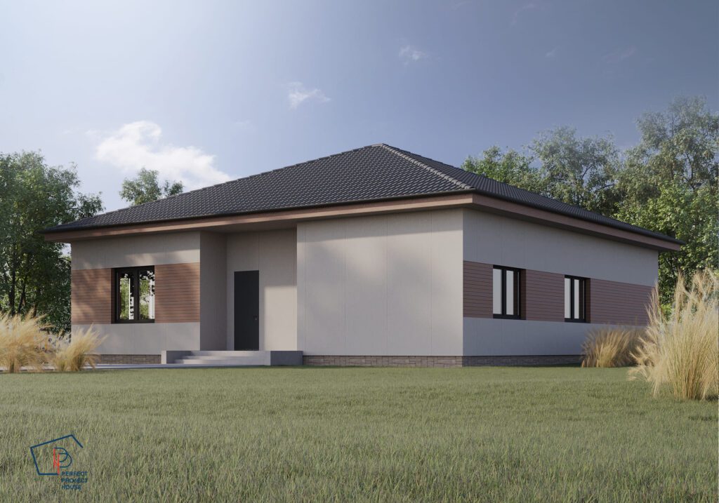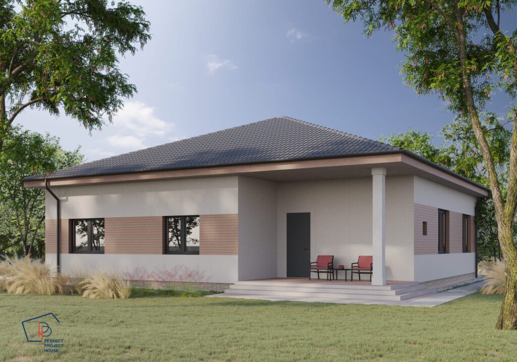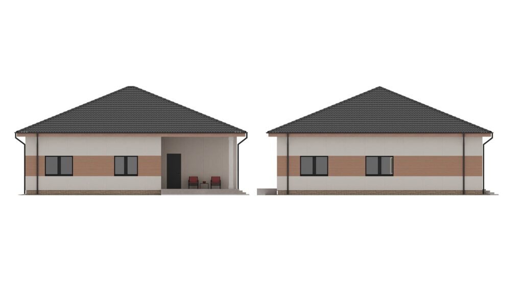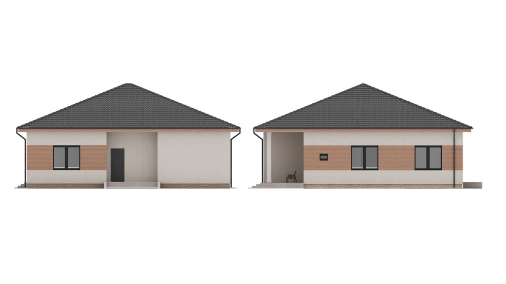 Одноэтажный дом для семьи из 5-6 человек построен из современного и относительно недорогого материала – пеноблоков. Они качественные и прочные, но имеют неприглядный внешний вид. Фасад дома было решено облицевать стройматериалами в бело-бежевой гамме, за счет чего он эффектно гармонирует с темно-коричневыми оконными рамами. Пожеланием заказчика было обустройство двух отдельных входов с крыльцом. Одно из них более просторное и в летнее время может выполнять роль небольшой террасы.