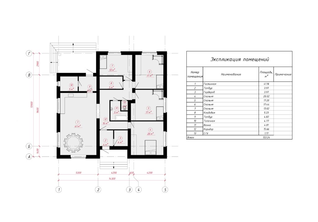 За счет отсутствия второго уровня и лестницы, которая заняла бы много пространства, на 153 м2 первого этажа удалось разместить четыре спальни площадью от 13 до 20 м2, подсобные помещения, просторный санузел, а также совмещенную гостиную и кухонную зону. Коттедж визуально разделяется на две части: с одной стороны располагаются спальные комнаты, а с другой – кухня-гостиная площадью 40 м2.