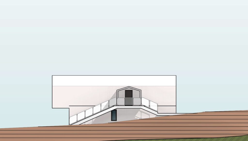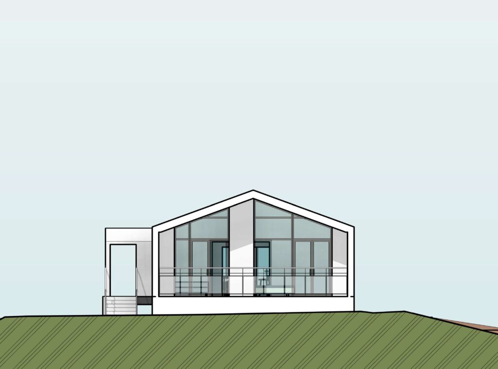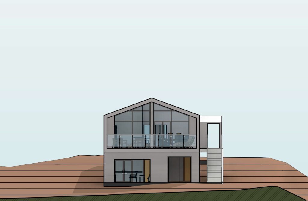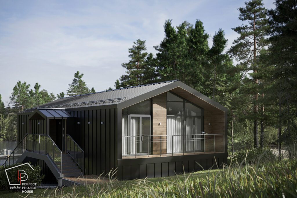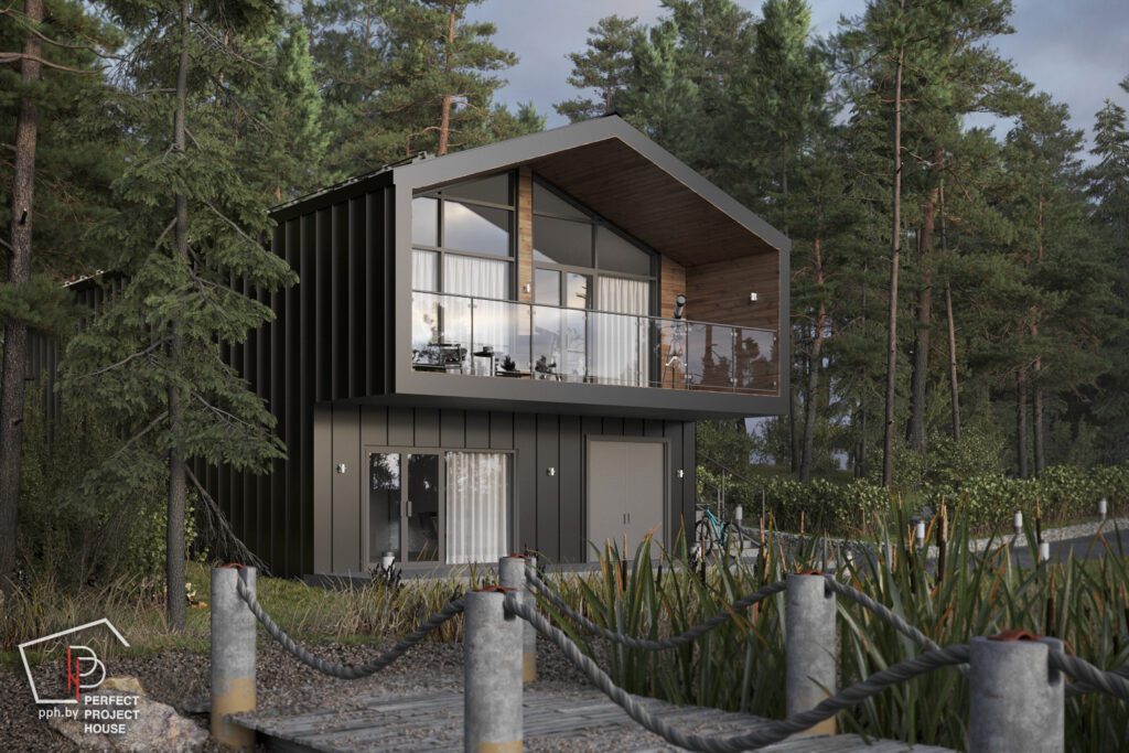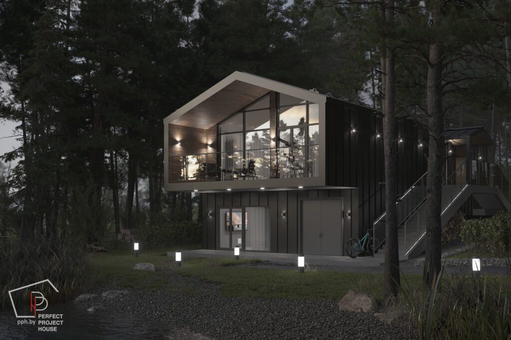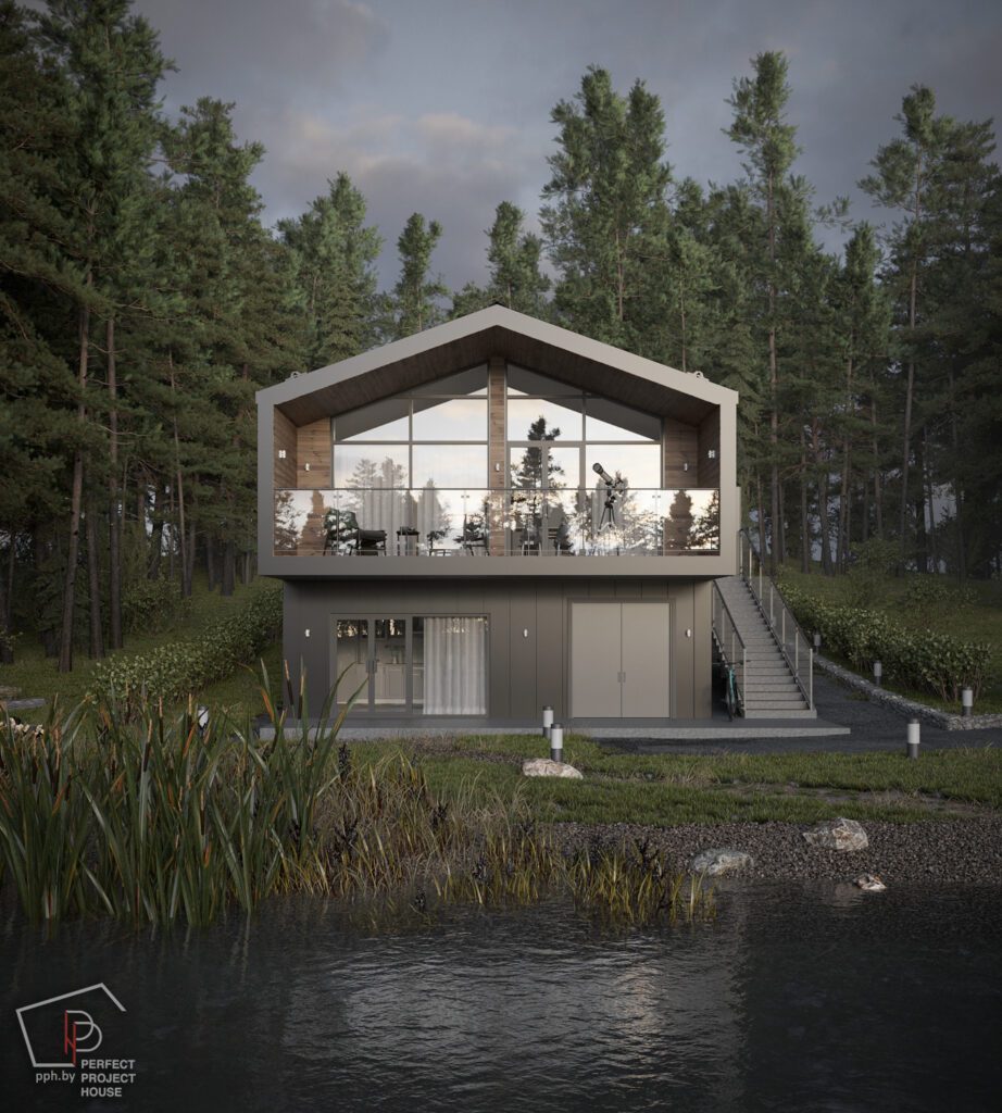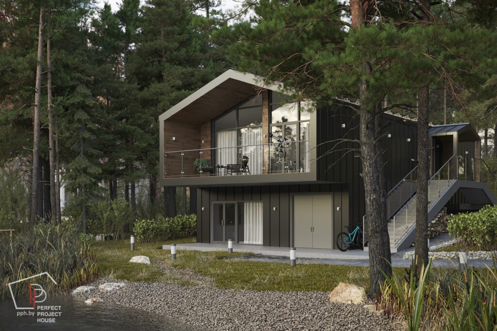 Дом со вторым светом можно назвать ярким образцом современной архитектуры. В его визуальном облике переплелись черты стилей баухаус и минимализм, которые добавляют изюминку и делают здание непохожим на ближайших соседей. Архитектурное решение здания отличается прямолинейностью. Плоская кровля оригинально сочетается с обилием остекления и дополняется стильной отделкой фасадов в виде темно-серого сайдинга.