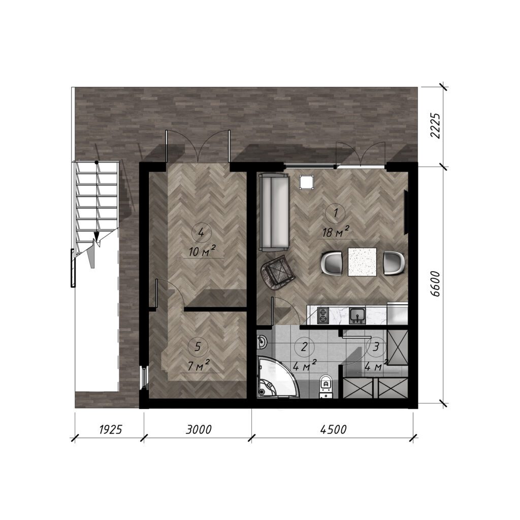 На втором этаже размещаются еще одна кухня, санузел и две комнаты. Одна из них имеет выход на большой балкон, оснащенный стеклянными перилами. Чтобы попасть на верхний уровень, необходимо подняться по лестнице с улицы, поэтому дом может стать оптимальным решением для двух небольших семейств.