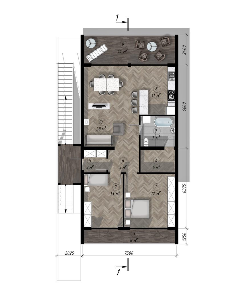 Общая площадь дома – 133,11 м2. На первом этаже располагаются кухня-столовая, две спальни и ванная комната. Вся гостиная обустроена со вторым светом, что делает ее максимально просторной и солнечной.