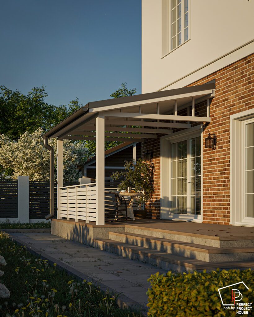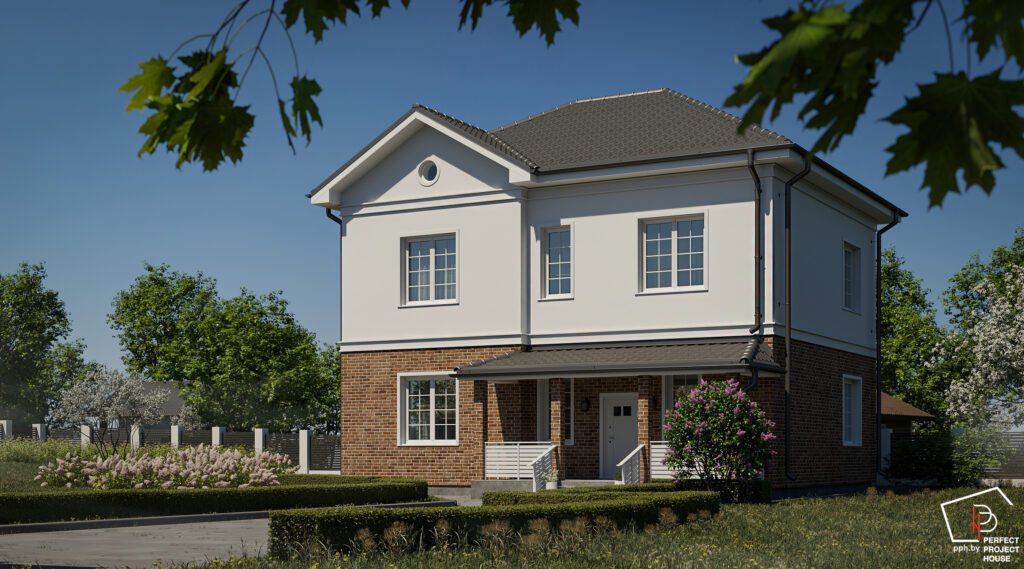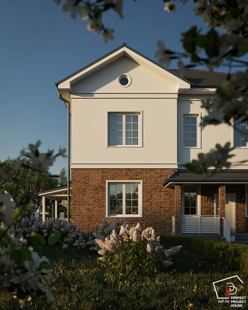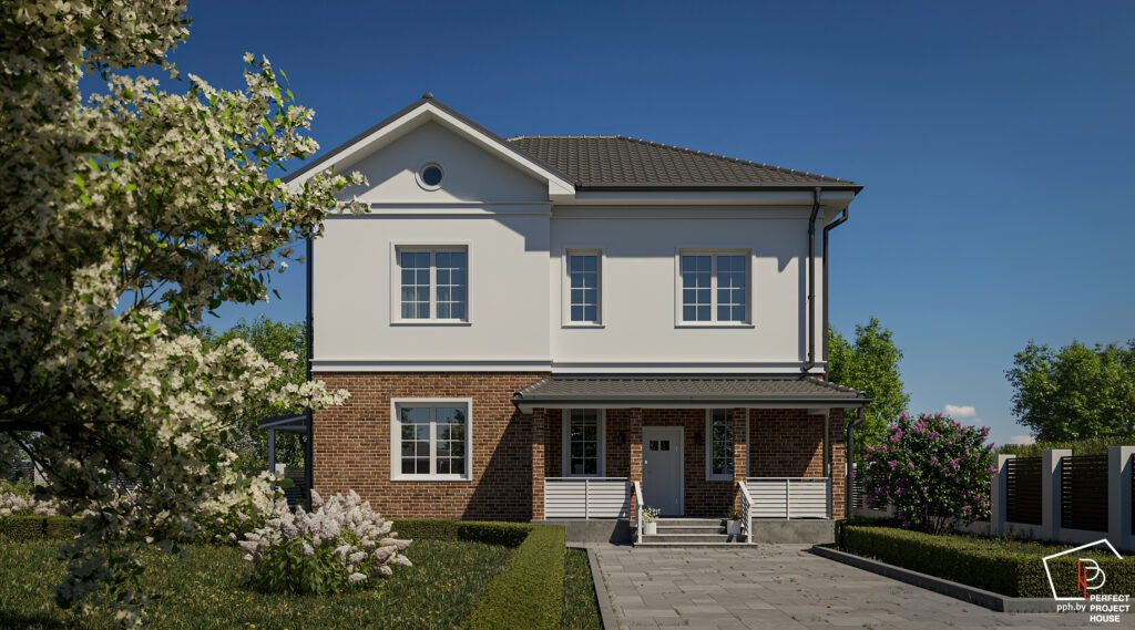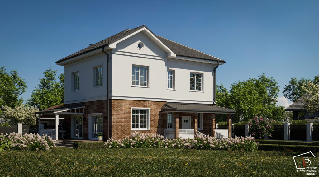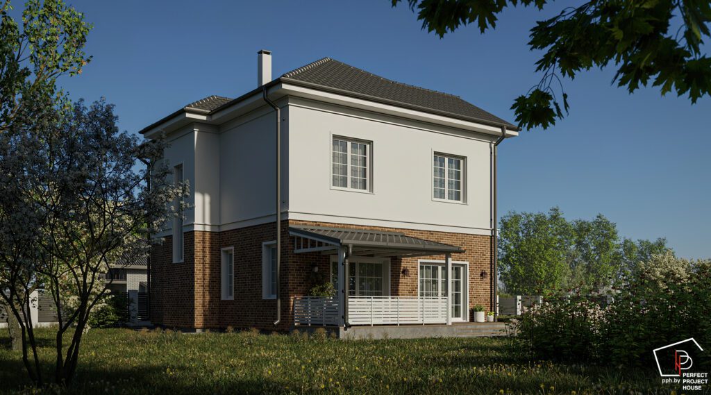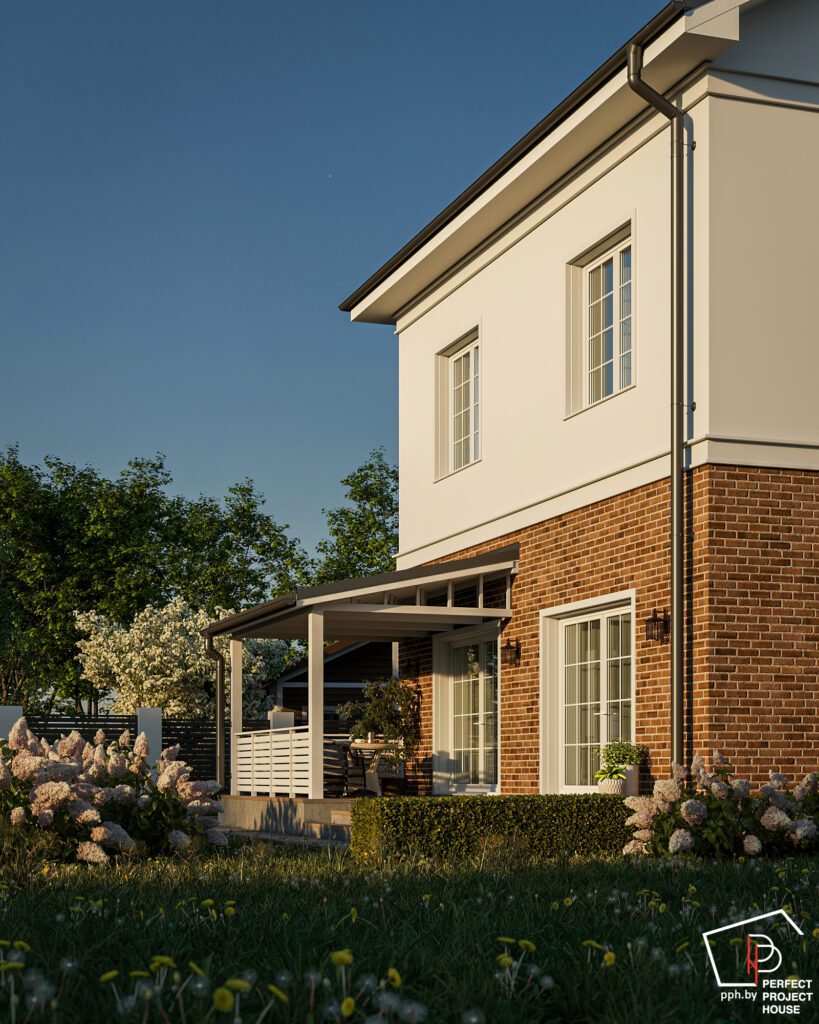 Визуальный облик дома выполнен в классической архитектуре. Фасады нижнего этажа украшены красным облицовочным кирпичом, а верхние стены имеют отделку из светлой штукатурки, что создает эффектный и оригинальный контраст. В задней части здания предусмотрена крытая терраса, огороженная белым парапетом из крашеного дерева.
