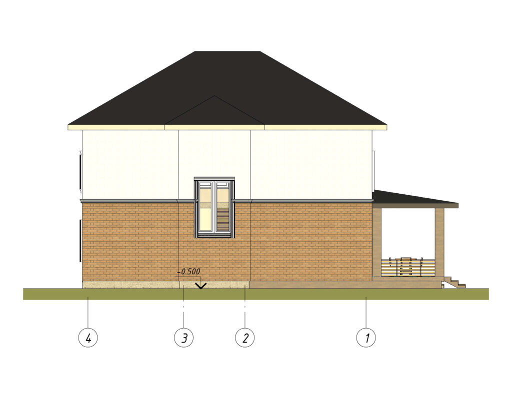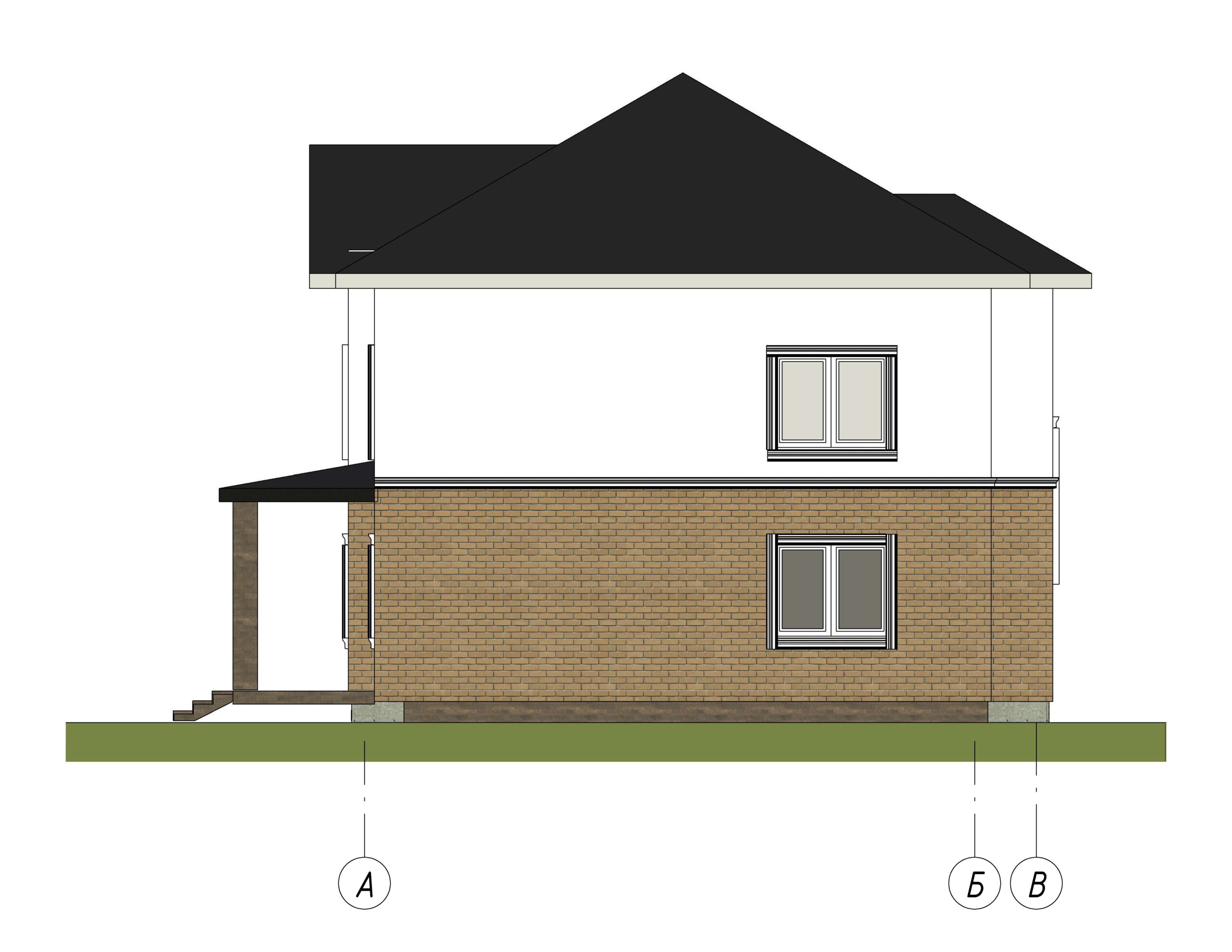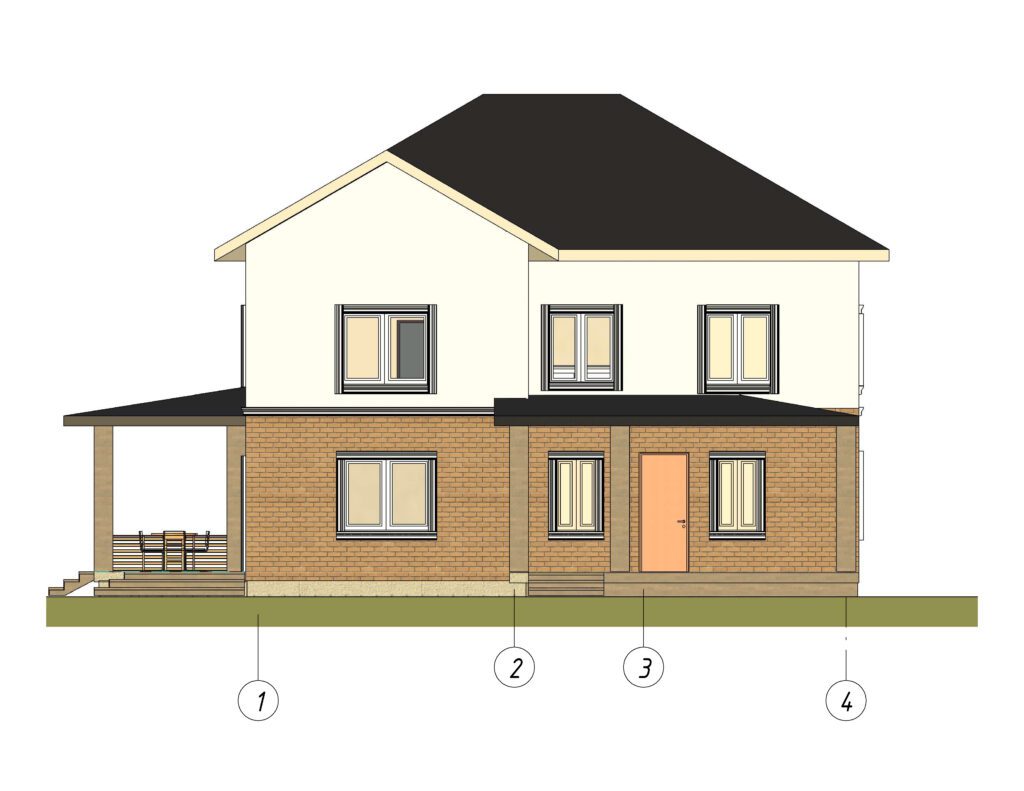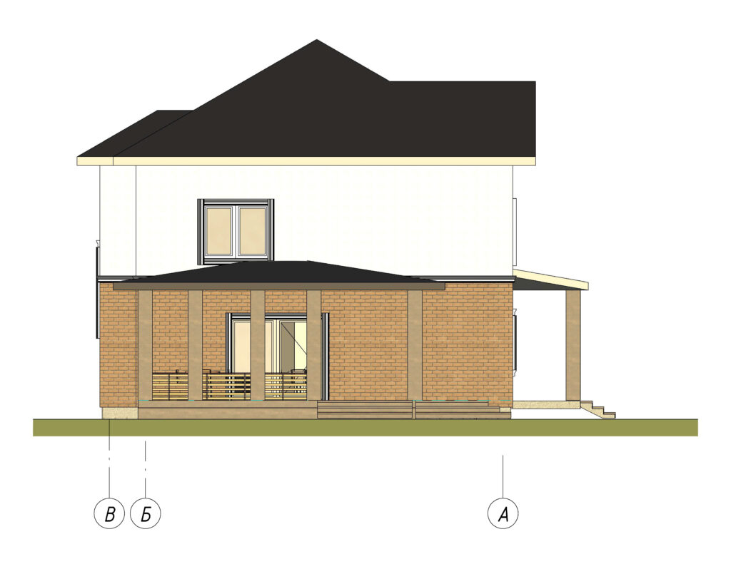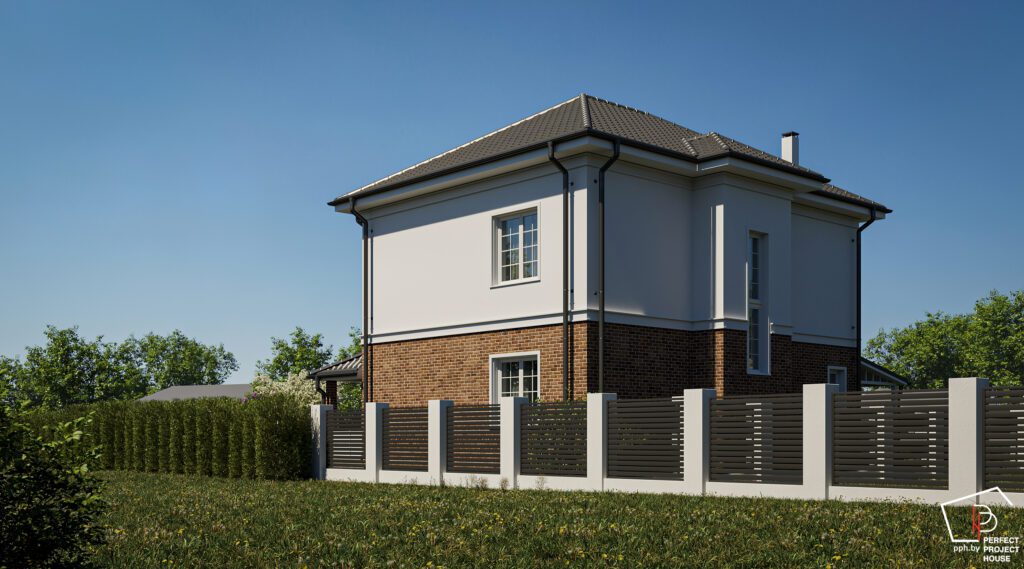 Визуальный облик дома выполнен в классической архитектуре. Фасады нижнего этажа украшены красным облицовочным кирпичом, а верхние стены имеют отделку из светлой штукатурки, что создает эффектный и оригинальный контраст. В задней части здания предусмотрена крытая терраса, огороженная белым парапетом из крашеного дерева.