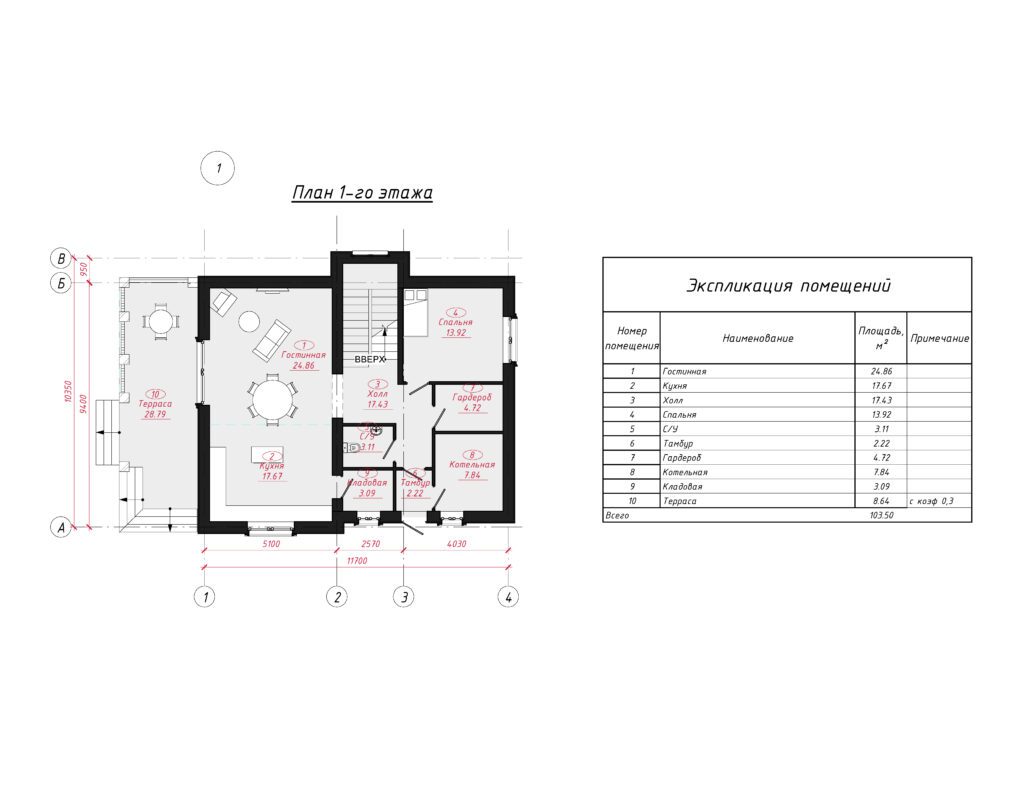 Двухэтажный кирпичный дом замечательно подойдет для семьи из 4–5 человек. Половину его первого этажа занимает большая кухня-гостиная, которая оборудуется столовой и выходом на террасу. Во второй половине размещаются гардеробная, котельная и уютная спальня, которая сможет стать отличным приютом для гостей.