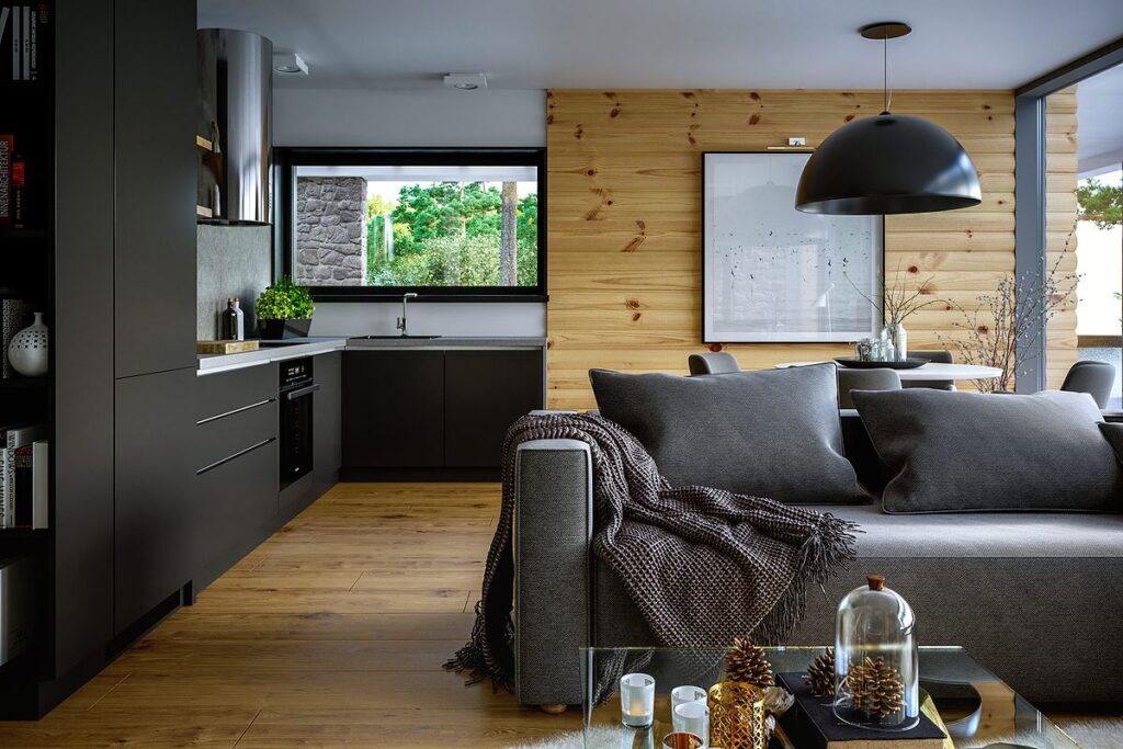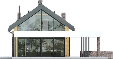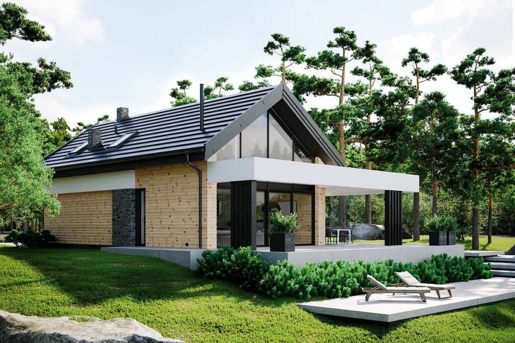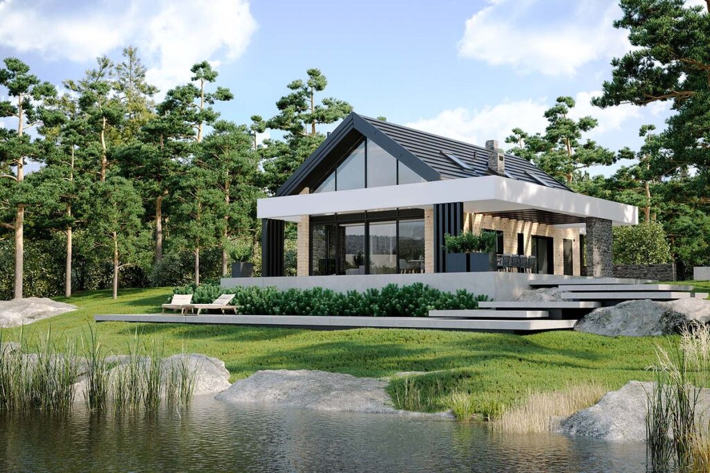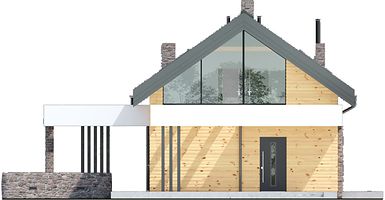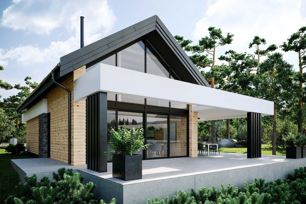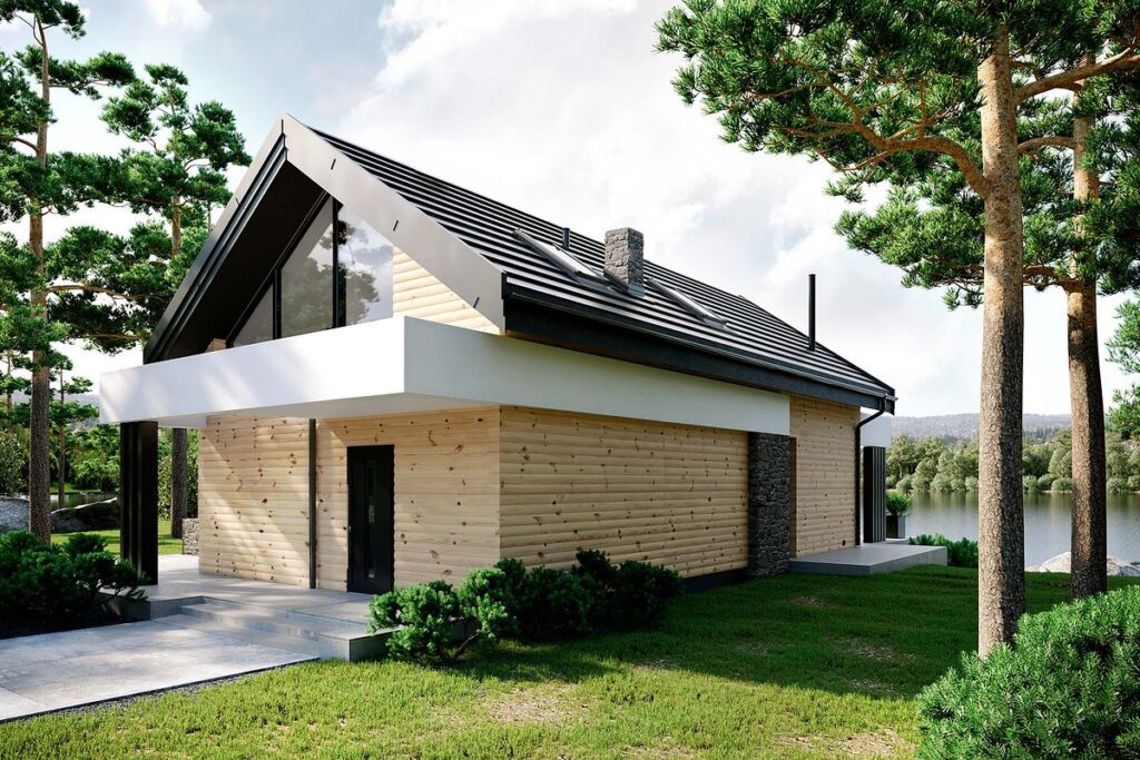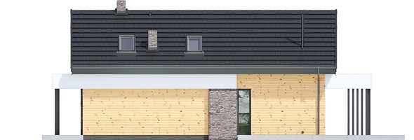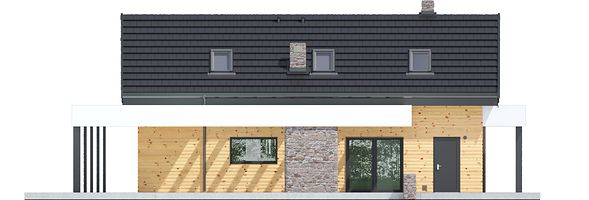 Комфортный двухэтажный дом идеально подходит для круглогодичного проживания семейства из 4 человек. Здание отличается просторной площадью в 185,9 м2 и имеет выраженное деление на две зоны – гостевую и жилую. Гостевая зона занимает первый этаж и включает в себя гостиную, кухню-столовую, подсобные помещения. Жилая зона на втором этаже состоит из трех спален, которые дополняются гардеробной комнатой и совмещенным санузлом. Стильная архитектура делает здание идеальным решением для обустройства загородного участка. Фасады сооружения богато отделаны деревянными балками, которые гармонично смотрятся в тандеме с темными вставками из антрацитовой керамической плитки. Почти по всему периметру здания оборудована широкая белая балка, которая придает ему эксклюзивности. Для отдыха можно использовать две открытые террасы, которые имеют выходы из кухни-гостиной.