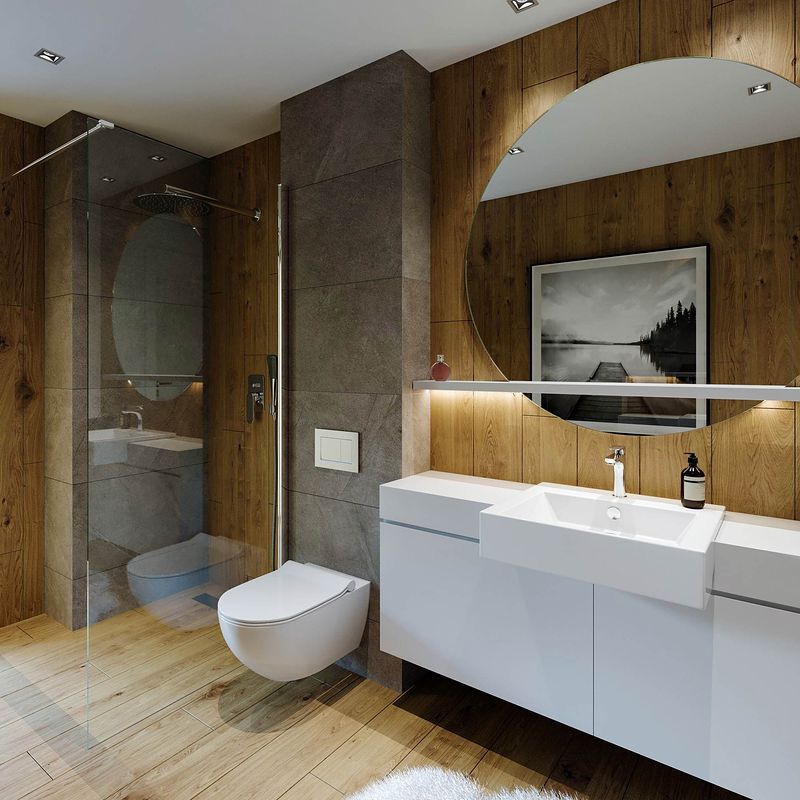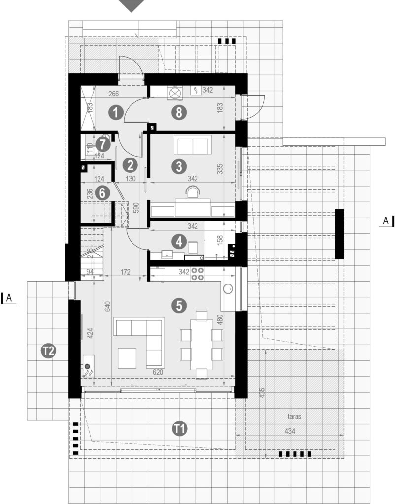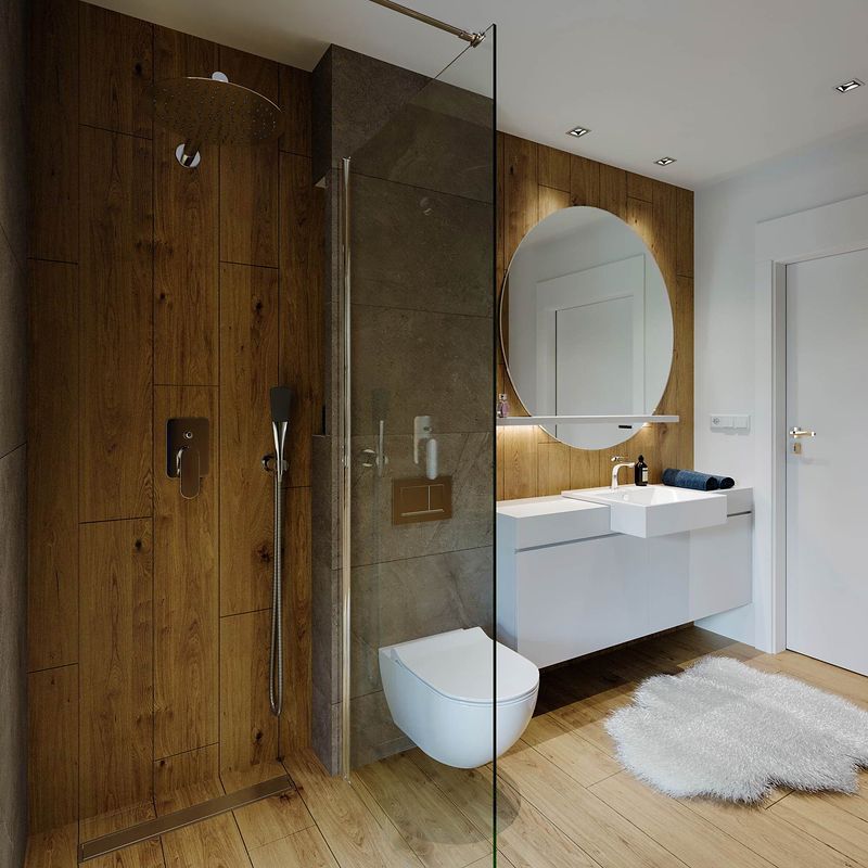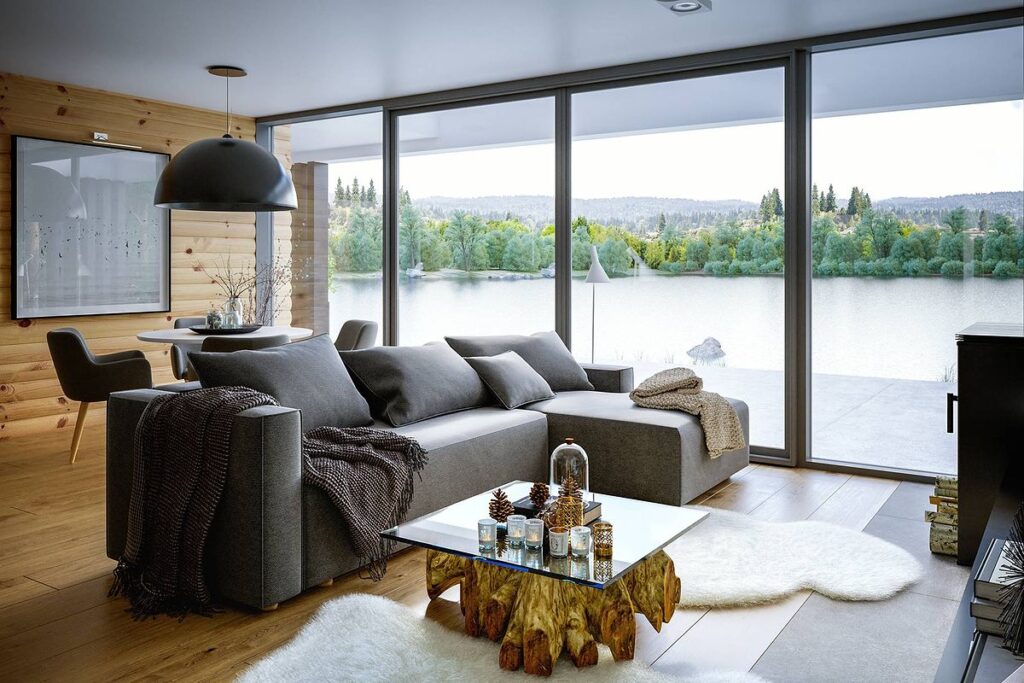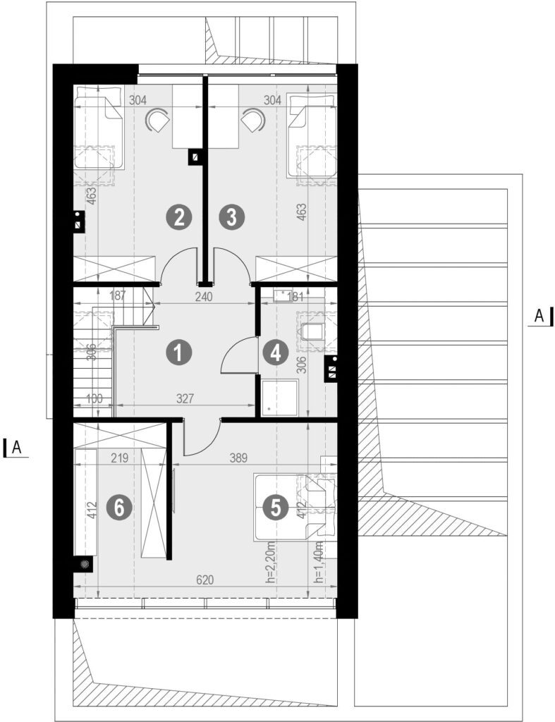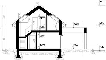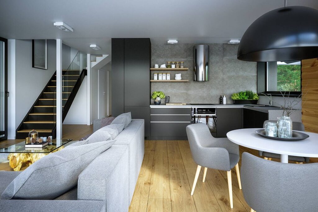 Комфортный двухэтажный дом идеально подходит для круглогодичного проживания семейства из 4 человек. Здание отличается просторной площадью в 185,9 м2 и имеет выраженное деление на две зоны – гостевую и жилую. Гостевая зона занимает первый этаж и включает в себя гостиную, кухню-столовую, подсобные помещения. Жилая зона на втором этаже состоит из трех спален, которые дополняются гардеробной комнатой и совмещенным санузлом. Стильная архитектура делает здание идеальным решением для обустройства загородного участка. Фасады сооружения богато отделаны деревянными балками, которые гармонично смотрятся в тандеме с темными вставками из антрацитовой керамической плитки. Почти по всему периметру здания оборудована широкая белая балка, которая придает ему эксклюзивности. Для отдыха можно использовать две открытые террасы, которые имеют выходы из кухни-гостиной.
