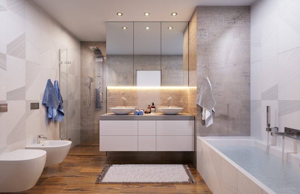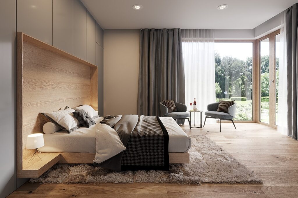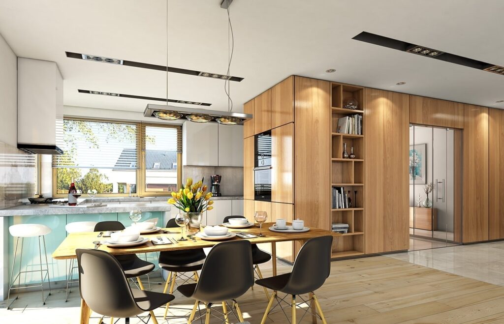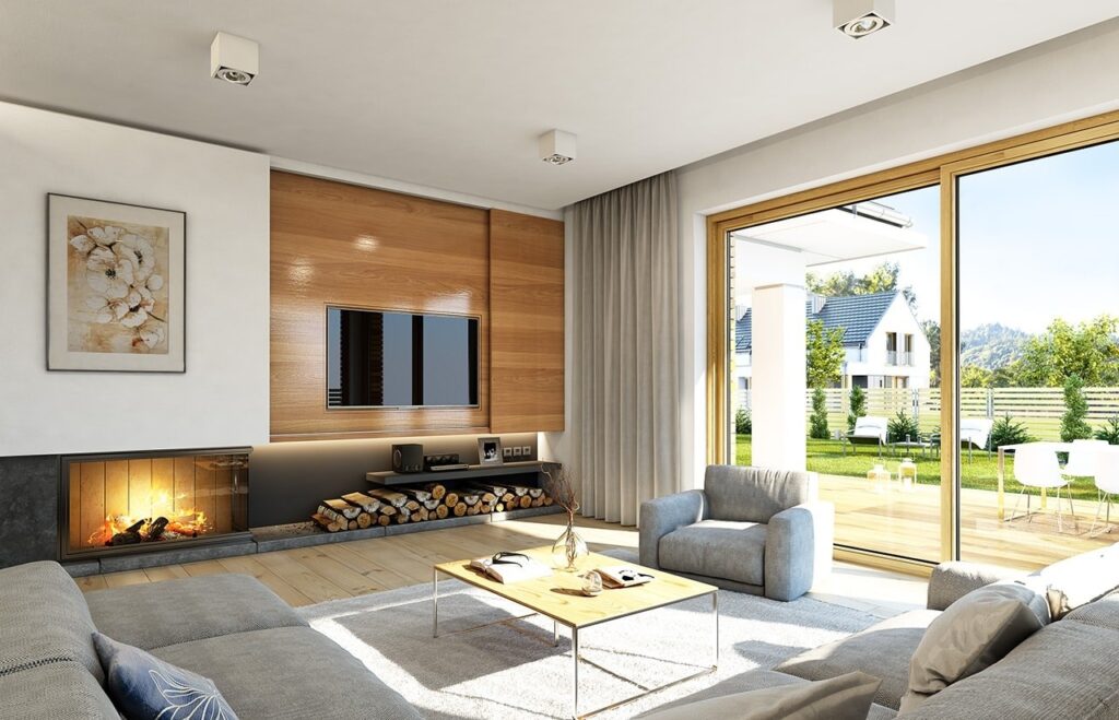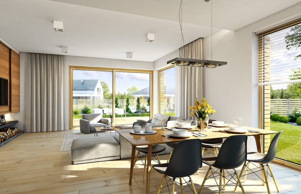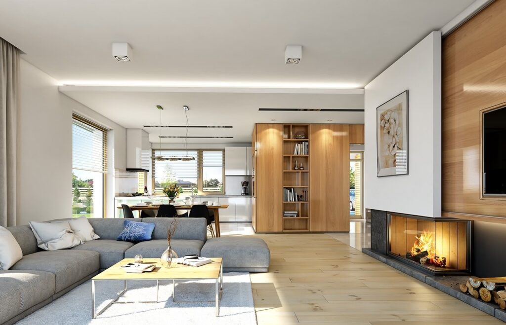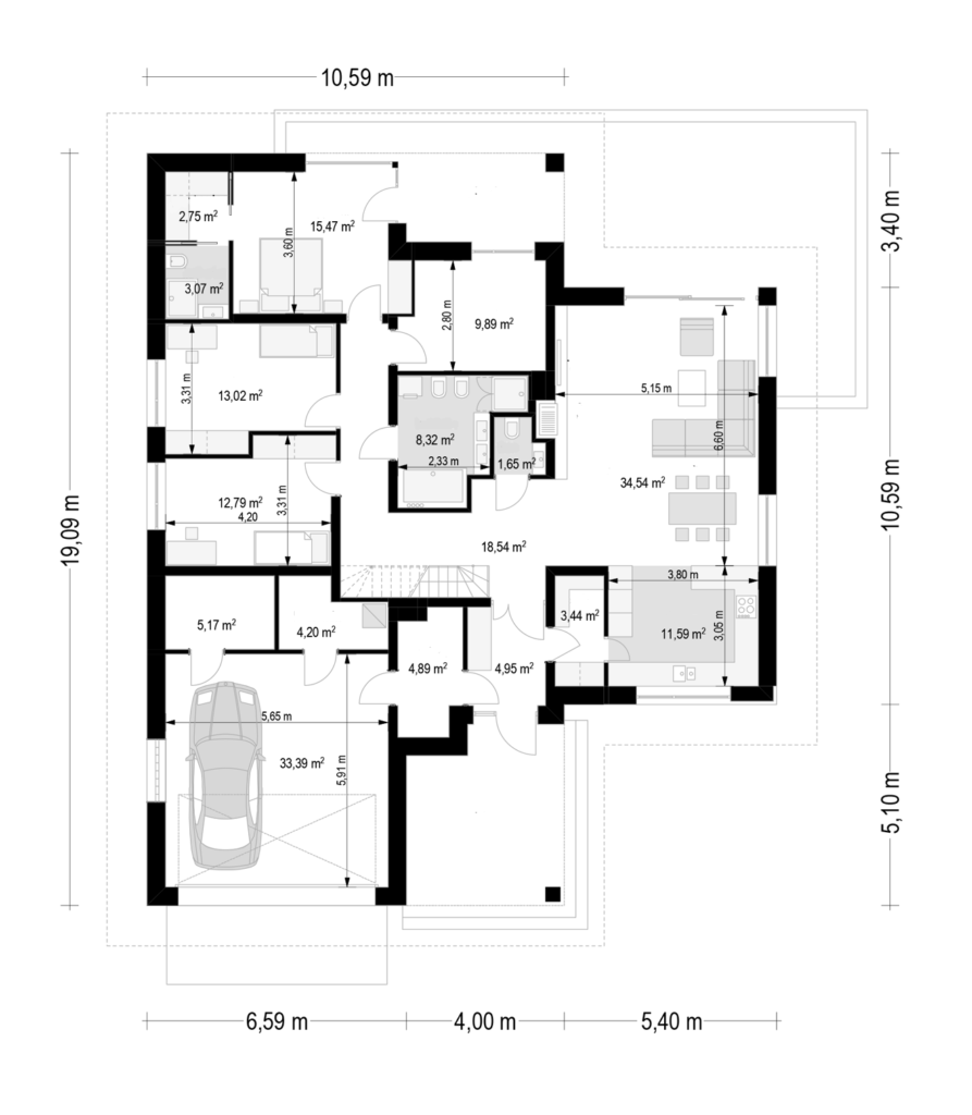 В планировке предусмотрено деление дома на две части – гостевую и спальную. В гостевой зоне находятся гостиная и кухня-столовая с выходом на открытую террасу. Для отдыха оборудованы три спальни, где могут с комфортом разместиться 3–4 человека. Жильцам доступны два санузла и гардеробная. Деревянная лестница ведет на чердак, где можно организовать системы хранения. Отдельная площадь дома отводится под гараж на один автомобиль, в котором оборудованы комнаты под котельную и кладовую.