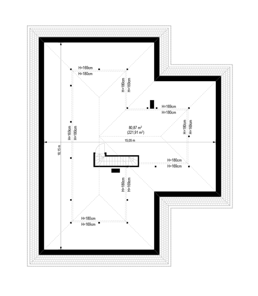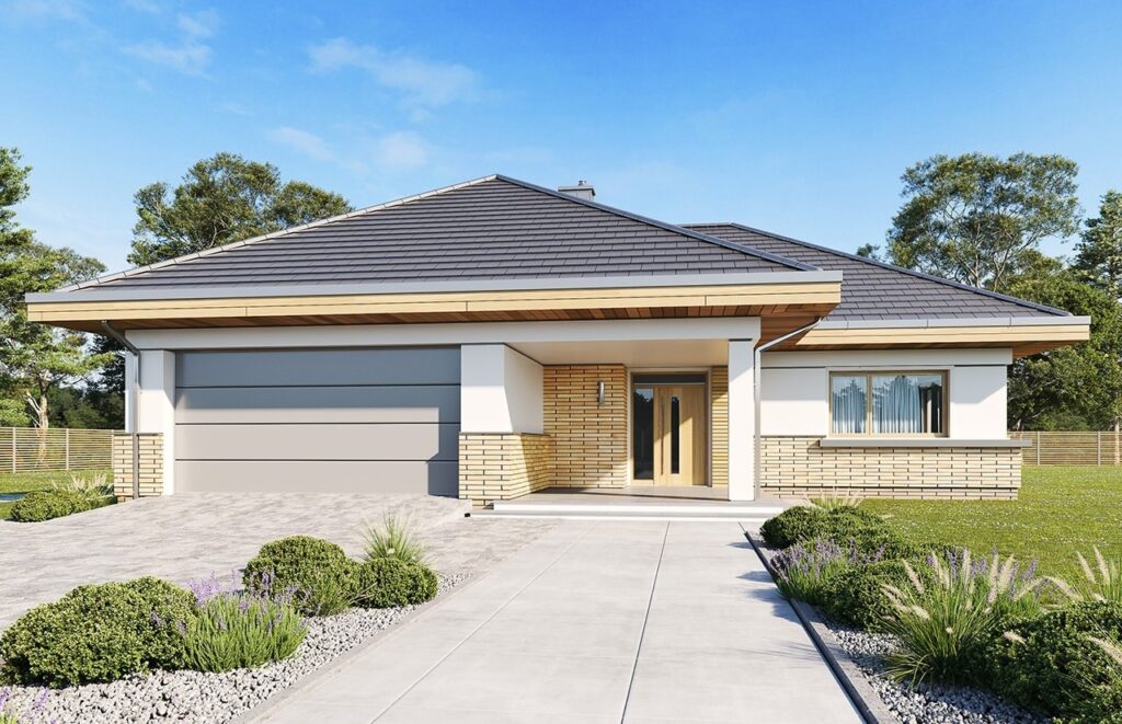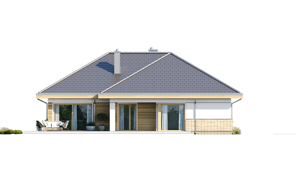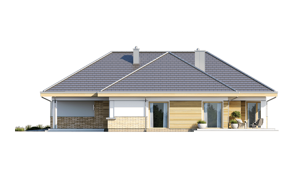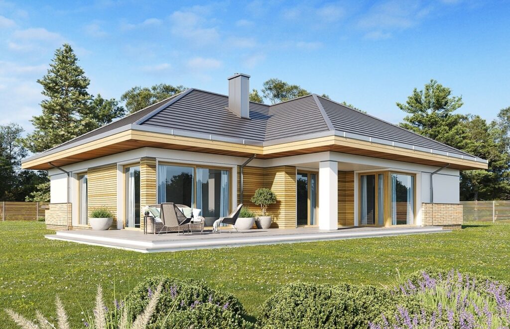 Предлагаем вашему вниманию эксклюзивный проект дома PPHouse 150-26 в Т-образной конфигурации. Одноэтажное здание имеет размеры 234,19 м2 и оснащается многоскатной кровлей, выполненной из черепицы. Светлые фасады отличаются большой площадью остекления. Высокие окна открывают доступ солнечному свету и эффектно смотрятся на фоне наружной отделки с деревянными фрагментами.