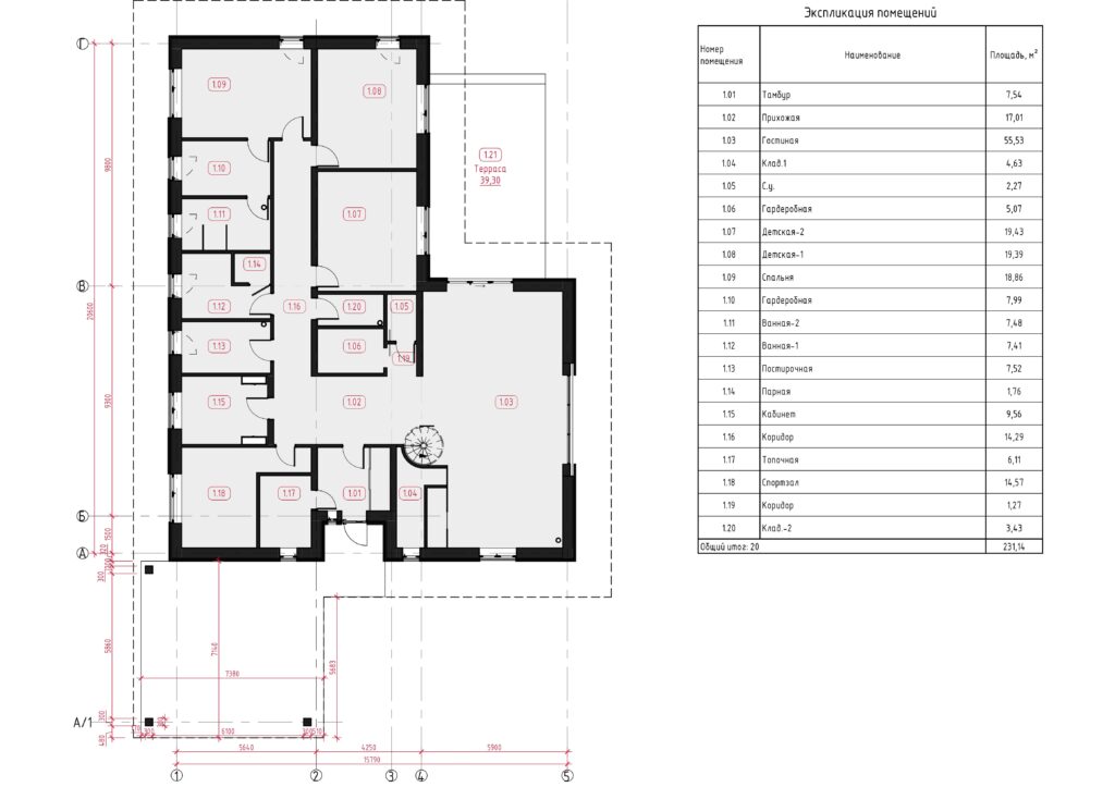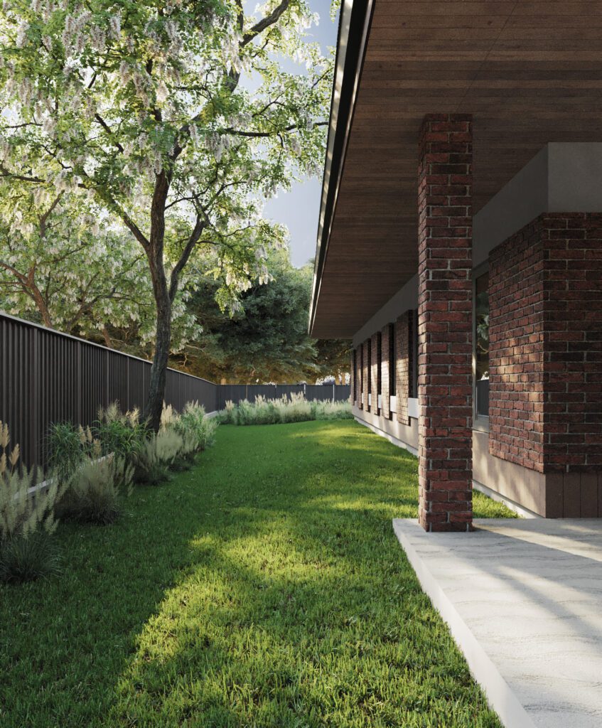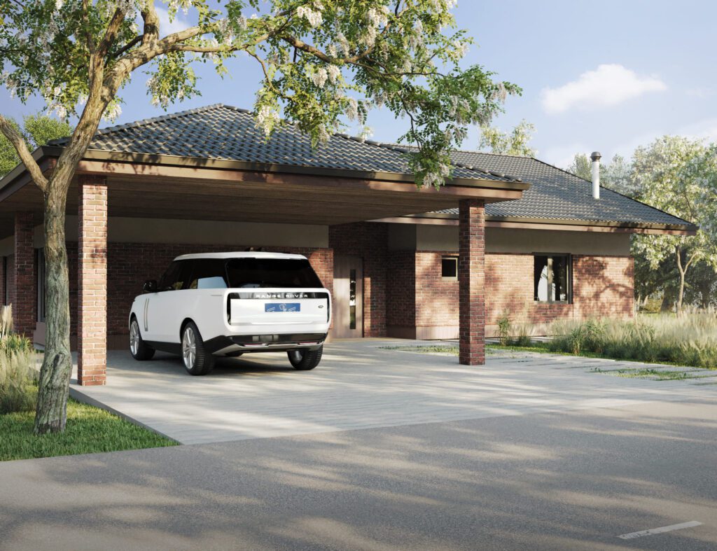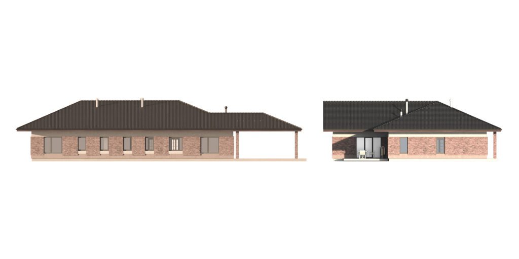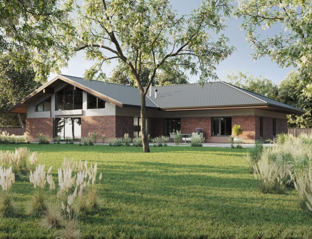 Проект дома со вторым светом выполнен в стиле лофт. Одноэтажное здание площадью 285,3 м2 отличается оригинальной краснокирпичной отделкой фасадов, которая гармонично дополняется черепичной кровлей и большой площадью остекления. Рядом с домом предусмотрена открытая терраса, на которую можно попасть из гостиной. Отдельным элементом наружного облика выступает массивный навес на кирпичных колоннах, предназначенный для размещения автомобиля.