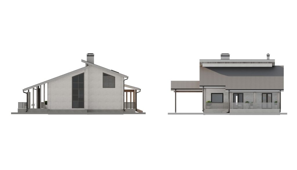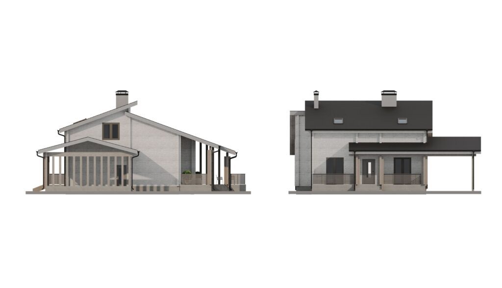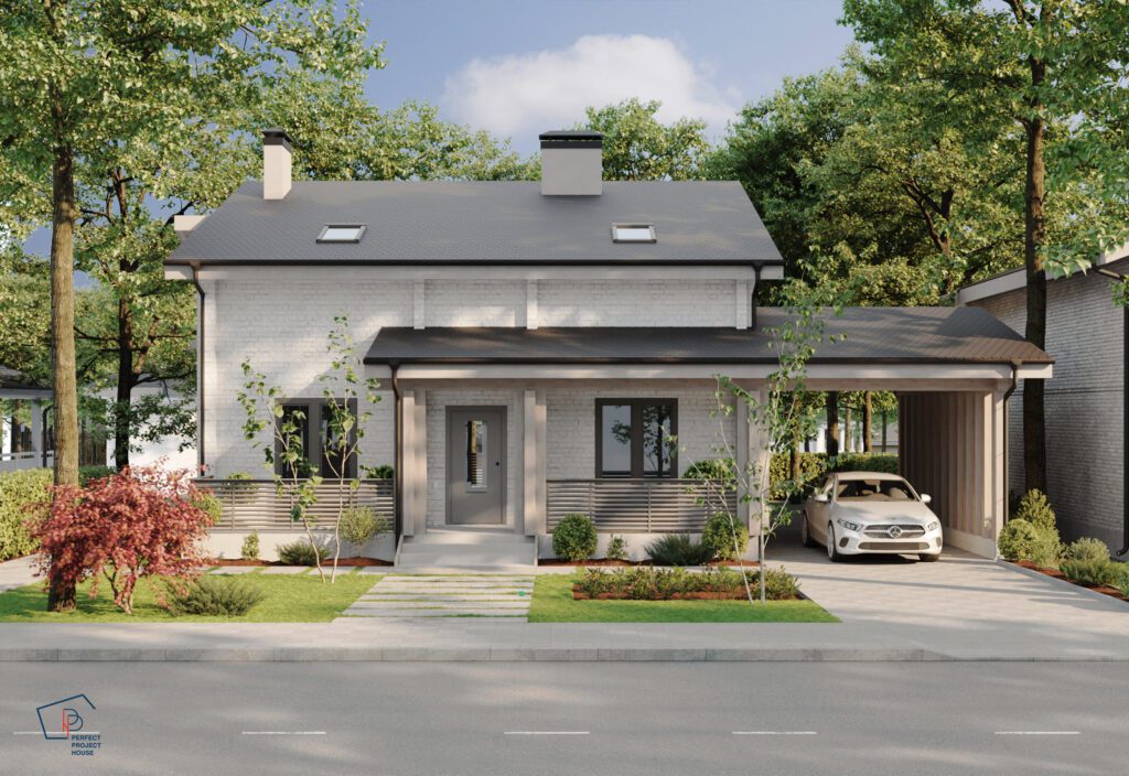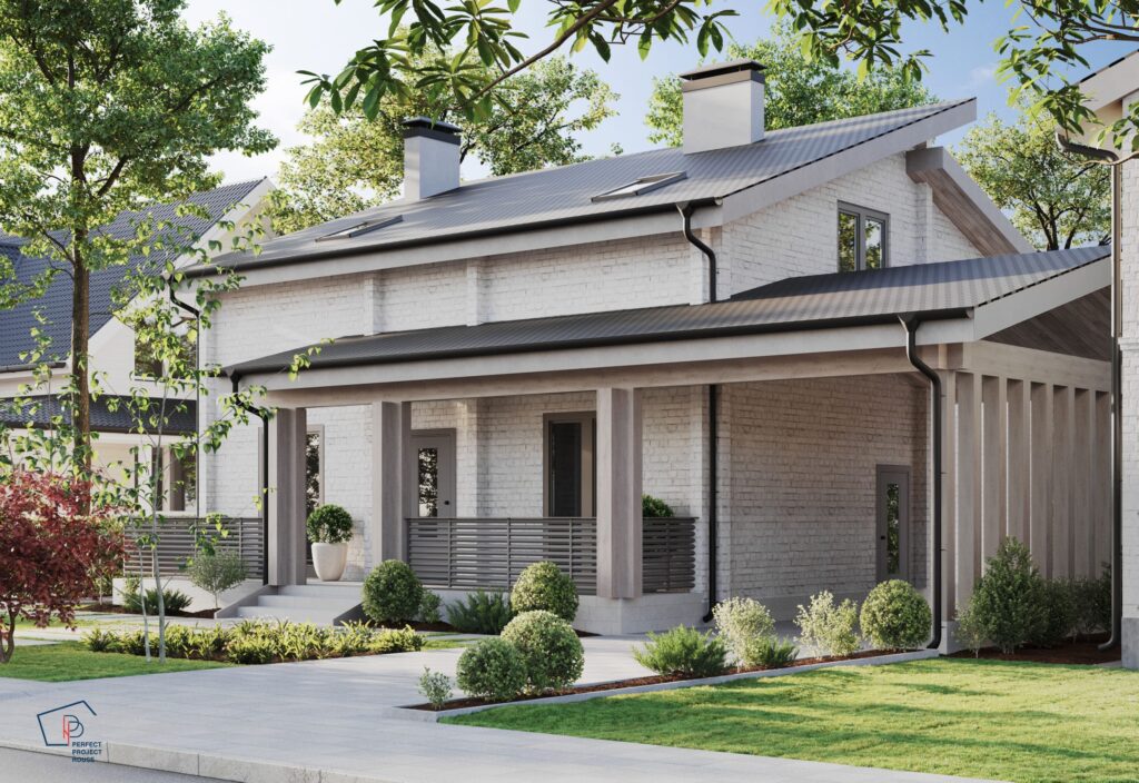 В двухэтажном доме с гаражом смогут уютно разместиться до 4–6 человек. Здание выполнено в стиле модерн и привлекает внимание своей необычной архитектурой с отделкой из серого кирпича. Светлые фасады хорошо смотрятся на фоне темной двускатной кровли и дополняются широким навесом, который обрамляет более половины здания.