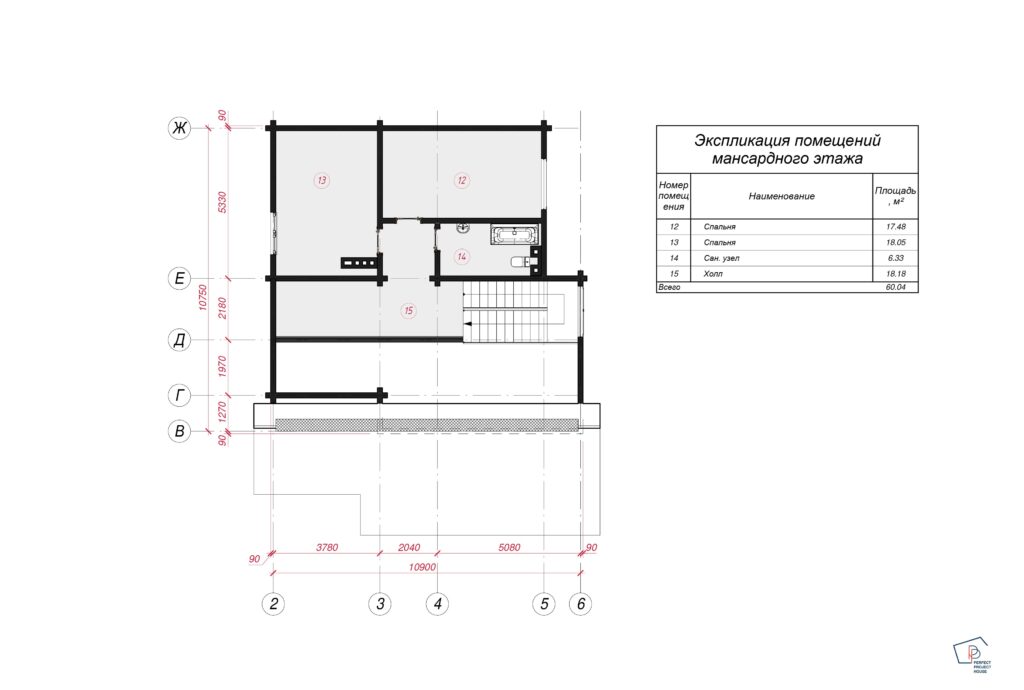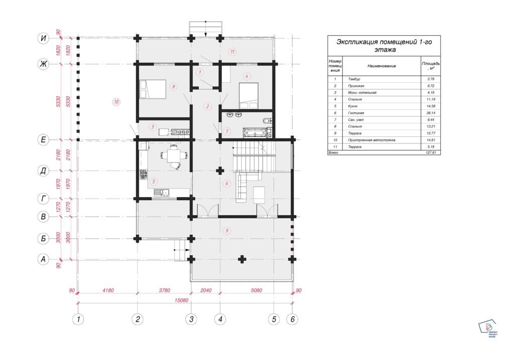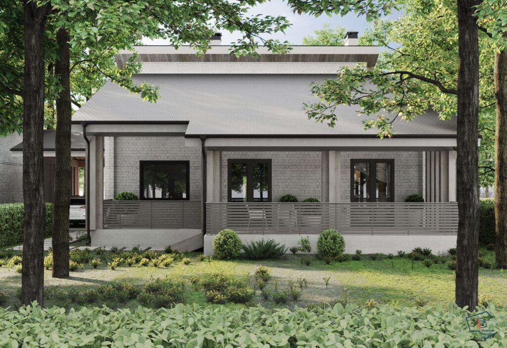 Общая площадь постройки – 187,85 м2. На первом этаже размещаются две спальни, кухня-гостиная, мини-котельная, ванная комната. Еще две спальни и санузел расположены в мансардной части. Значительная часть полезной площади находится за пределами здания. Под навесом можно найти широкое крыльцо, просторную террасу и место для хранения автомобиля, которое скрывается за оригинальной колоннадой. В месте расположения лестницы предусмотрено высокое окно почти в два этажа, которое обеспечивает превосходную инсоляцию помещений.