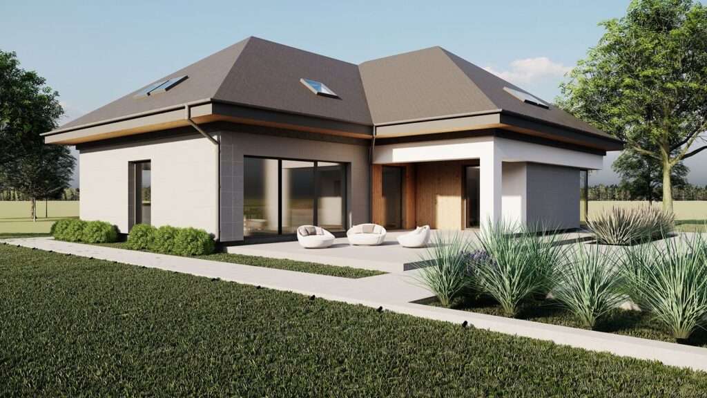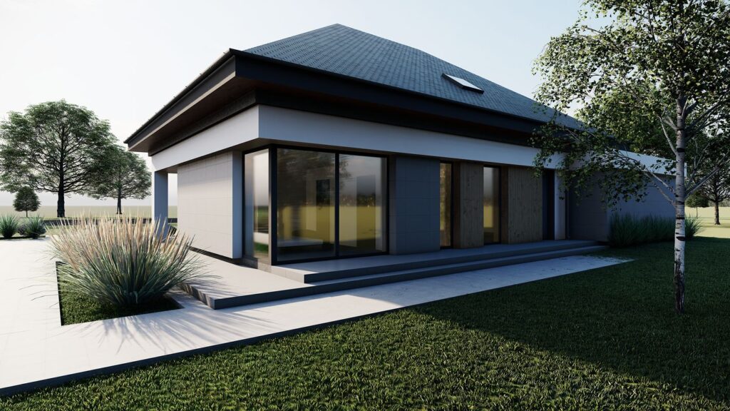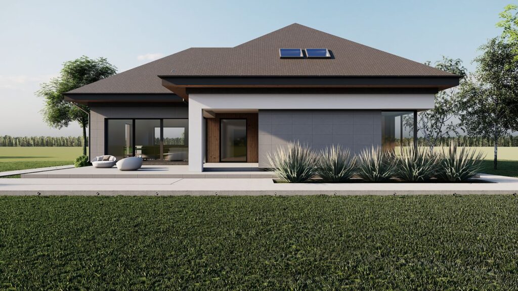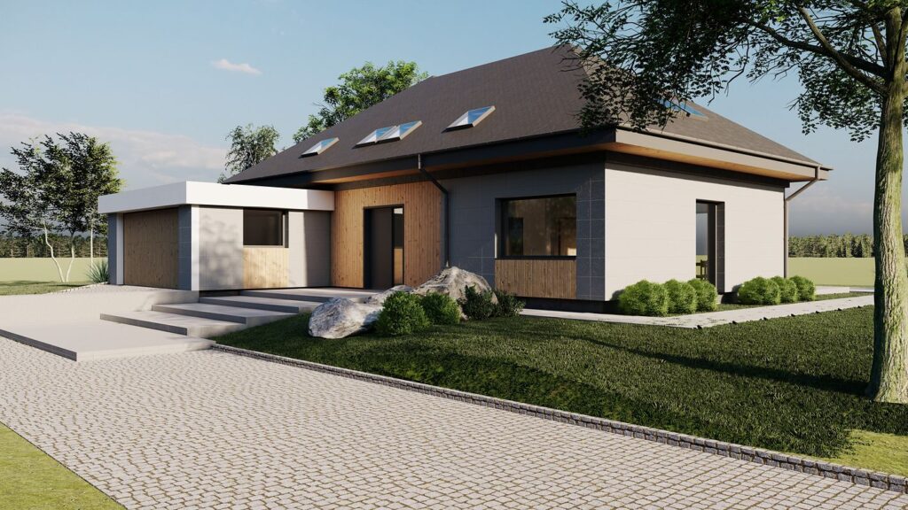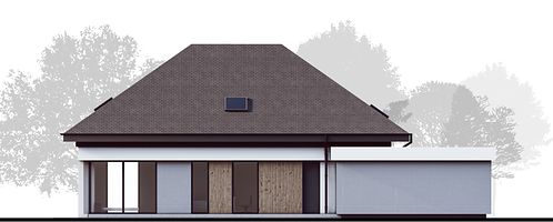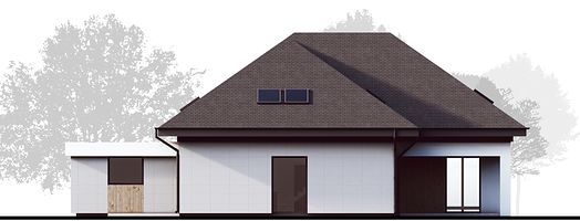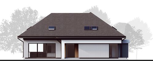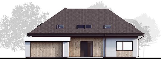 Визуальный облик здания привлекает строгими формами и обилием остекления. Фасады отделаны минеральной фактурной штукатуркой, которая разбавляется оригинальными деревянными вставками. Кровля покрыта керамической черепицей. Удлиненный навес гаража создает перголу, которая в сочетании с вьющимися растениями может стать необычным декоративным элементом постройки. Дополнительно в доме предусмотрен чердак, который можно адаптировать под любые потребности жильцов.