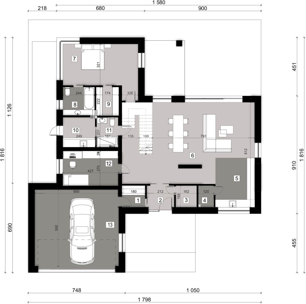 Дом с цокольным этажом – это прекрасный выбор для семьи из 4–6 человек. Он отличается продуманной планировкой и делится на зоны, которые размещаются на разных этажах. В цоколе оборудованы три спальни, санузел, гардеробные помещения. Большую часть первого этажа занимает кухня-гостиная с выходом в гараж на одну машину. Остальная площадь отводится под гостевую спальню с ванной и подсобные помещения.