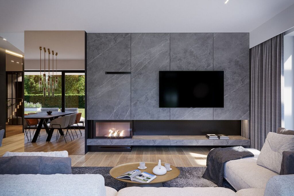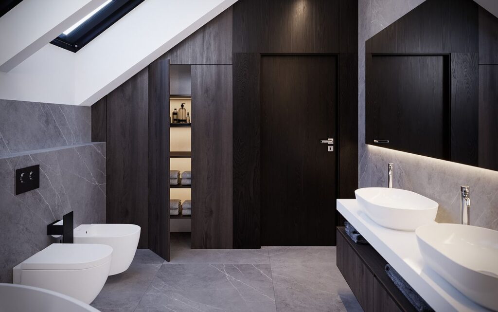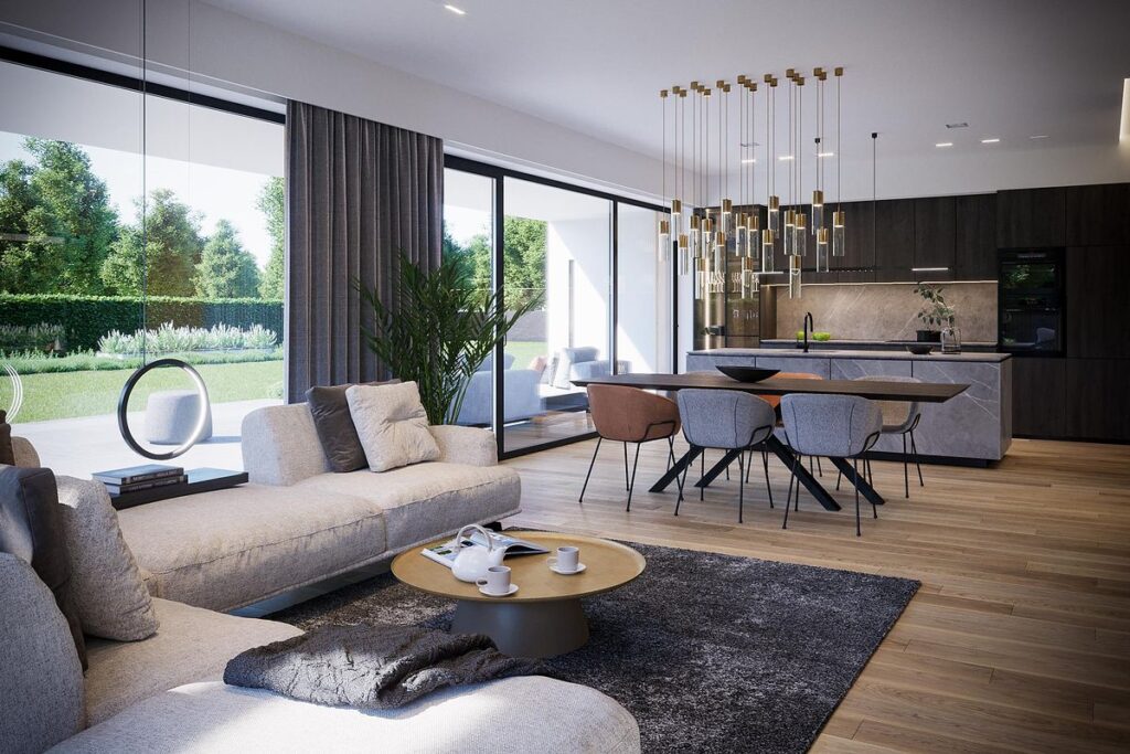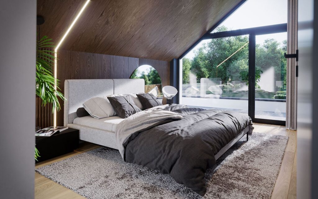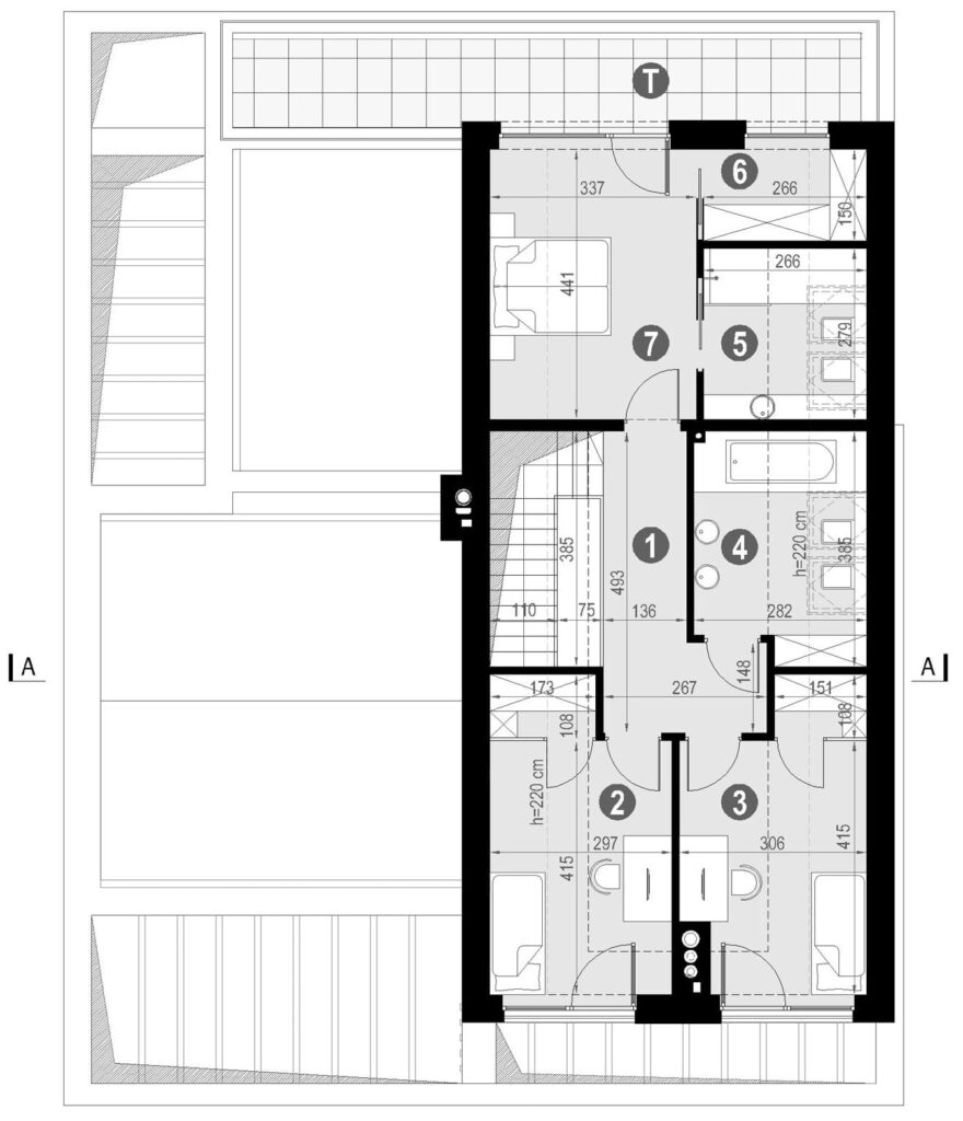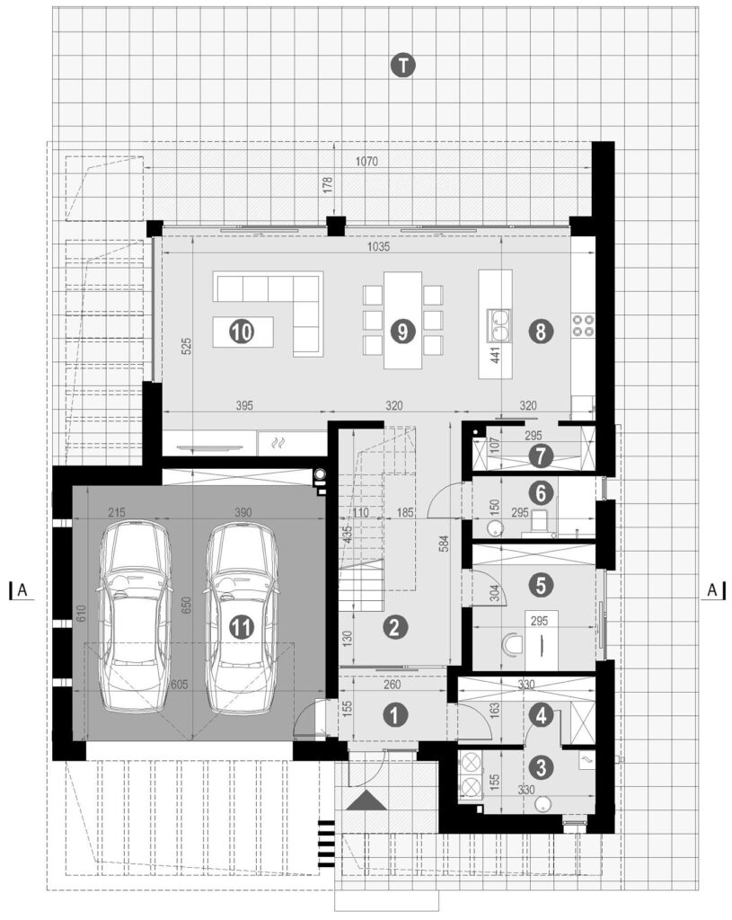 Элегантный внешний облик органично перекликается с продуманными планировочными решениями дома. Первый этаж занимают кухня-столовая, гараж на два авто, хозяйственные помещения. На втором этаже располагается спальная зона, где размещаются три спальни, гардеробная и санузел. Из спален можно выйти на большие открытые террасы, которые предусмотрены на навесных коробах. В дизайне комнат используются интересные детали и элементы, что делает интерьеры более презентабельными.