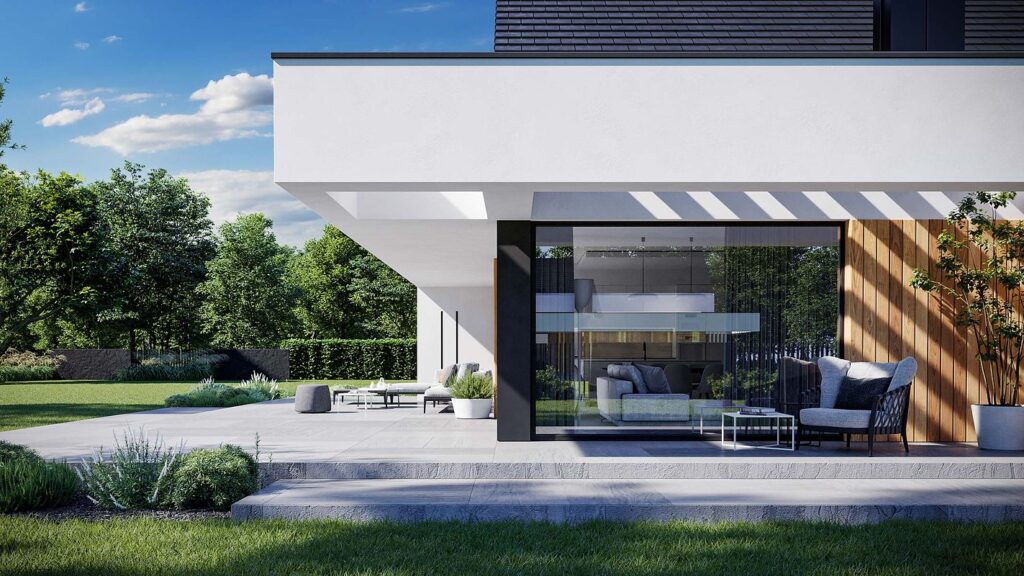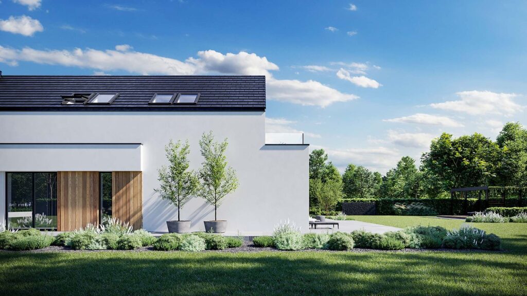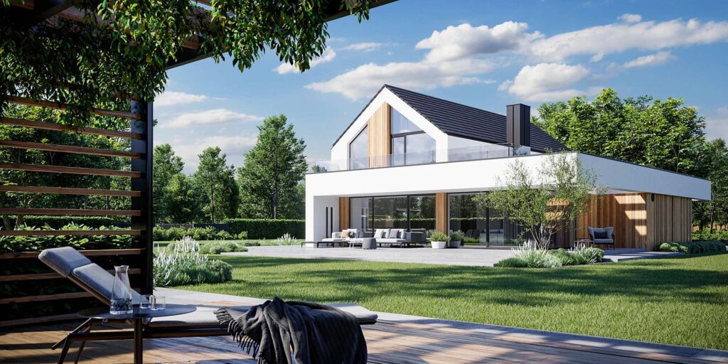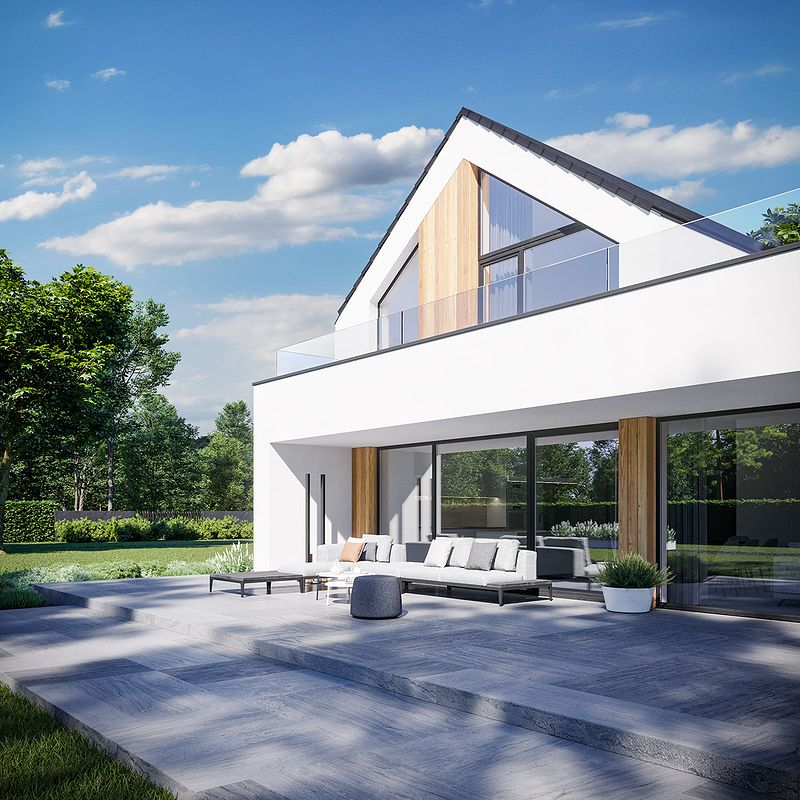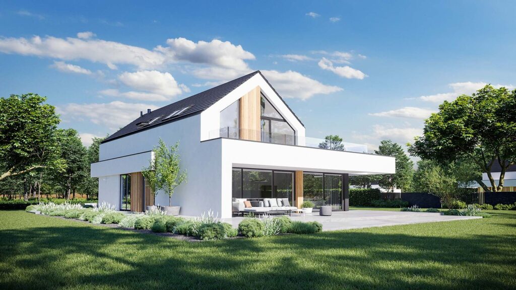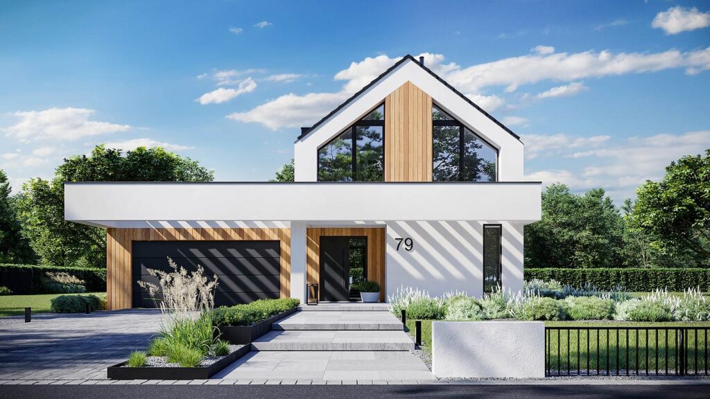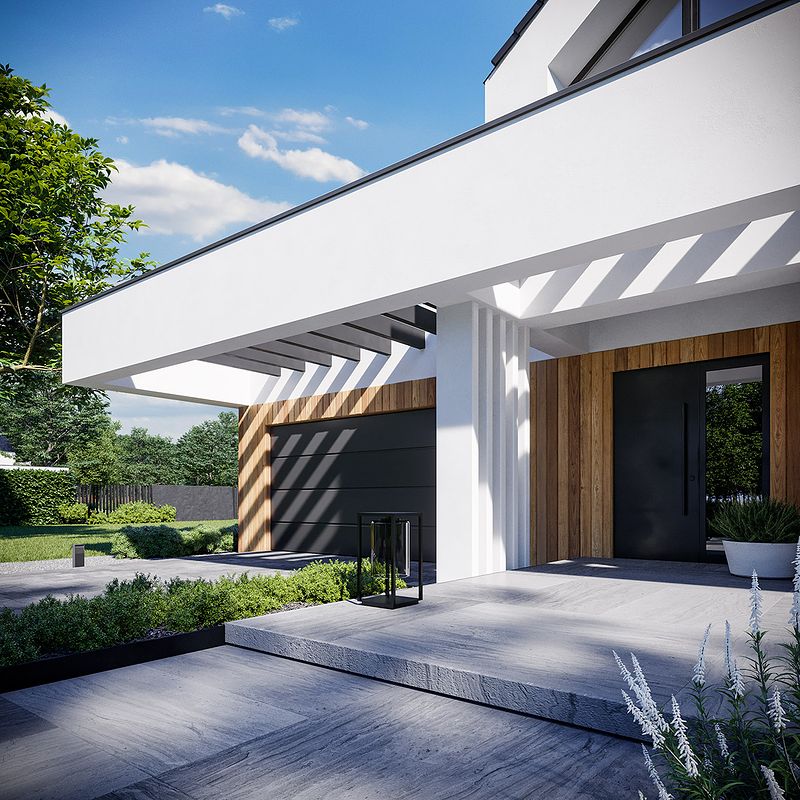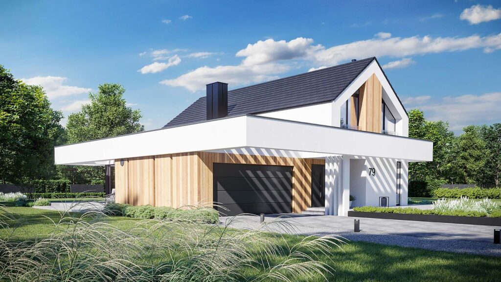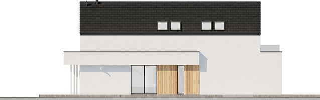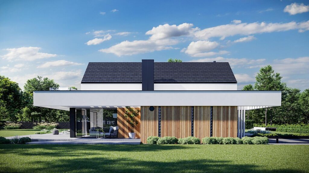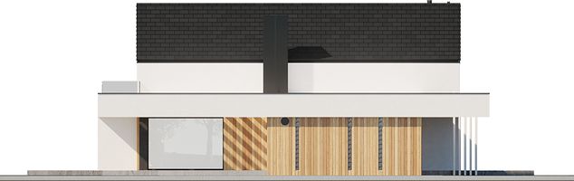 Если вы ищете варианты по-настоящему стильных и роскошных домов, обратите внимание на проект PPHouse 250-16. Двухэтажное здание площадью 290,71 м2 создано в современном стиле. Двускатная крыша без карнизов органично сочетается с клинкерной облицовкой стен и необычными элементами на фасадах, выполненными из древесины. Уникальность постройке придают коробчатые навесы, которые спроектированы в передней и задней части здания.