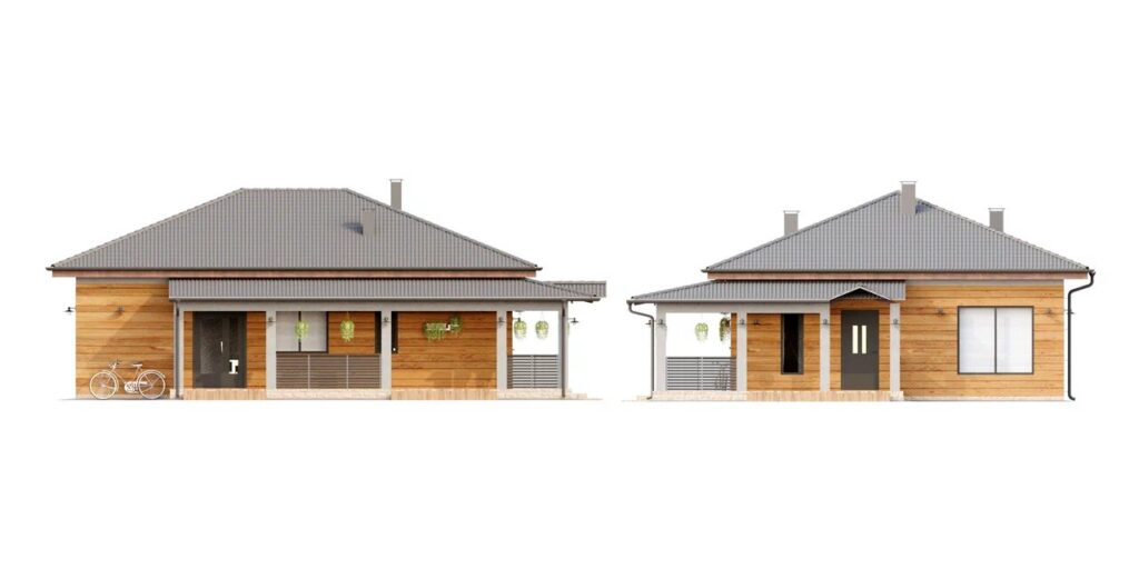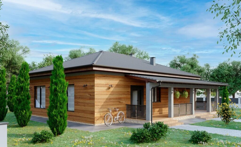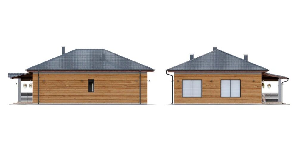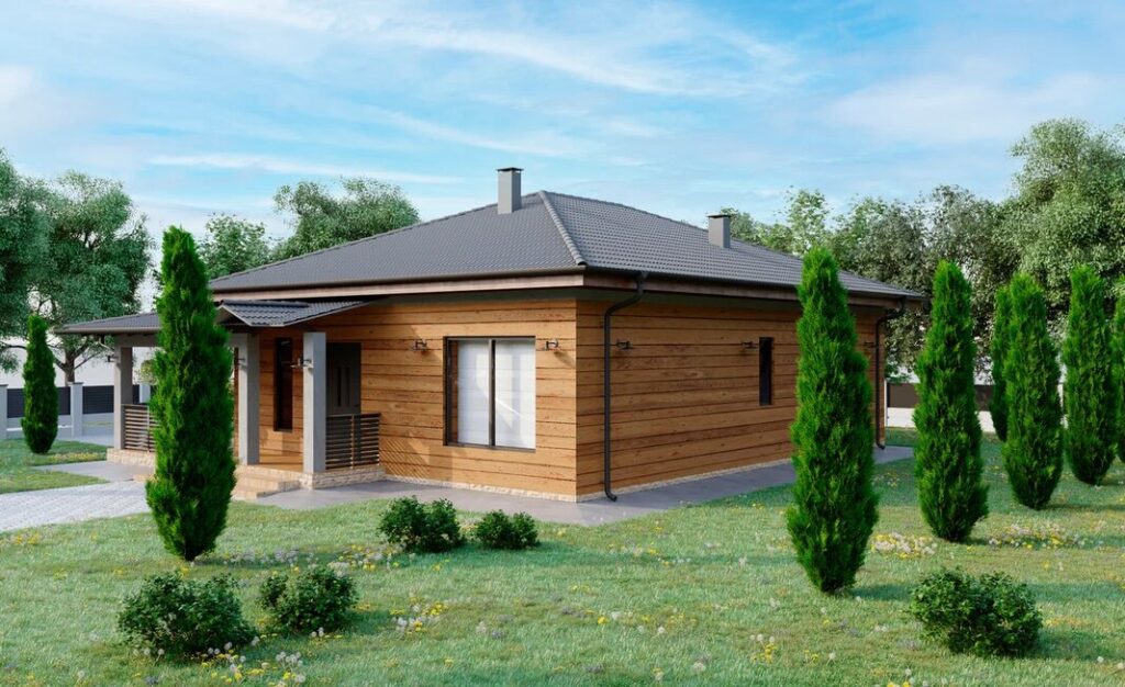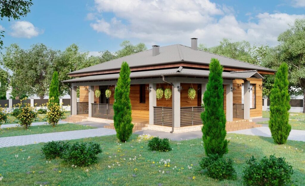 Добротный одноэтажный дом из бруса площадью 72,68 м2 – это отличный выбор для круглогодичного проживания. Он удобно вместит 2–3 человека и станет настоящим украшением загородного участка. В экстерьере здания преобладает натуральная древесина, которая эффектно дополняется черепичной крышей, небольшим крыльцом и широкими окнами. В задней части располагается открытая терраса, на которую можно попасть из кухни-гостиной.