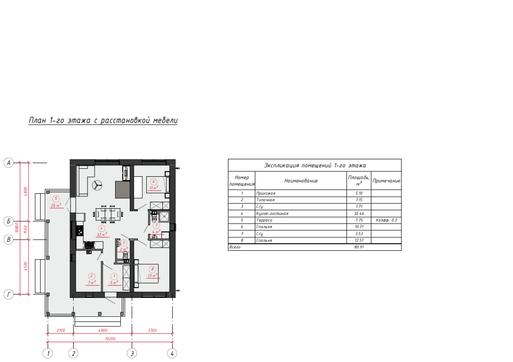 Внутри дома оборудованы две просторные спальни, полноценная ванная комната, кухня с зоной столовой. Для удобства жильцов предусмотрены мини-котельная и широкий коридор со встроенным шкафом-купе. Одна из главных особенностей проекта – грамотно продуманное остекление, которое исключает темные зоны в прихожей. Здание подойдет как для постоянного проживания за городом, так и для кратковременного визита семьи на время летних или зимних каникул.