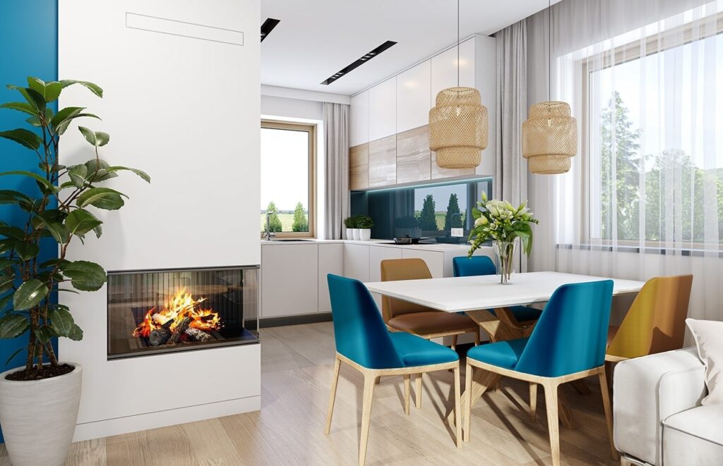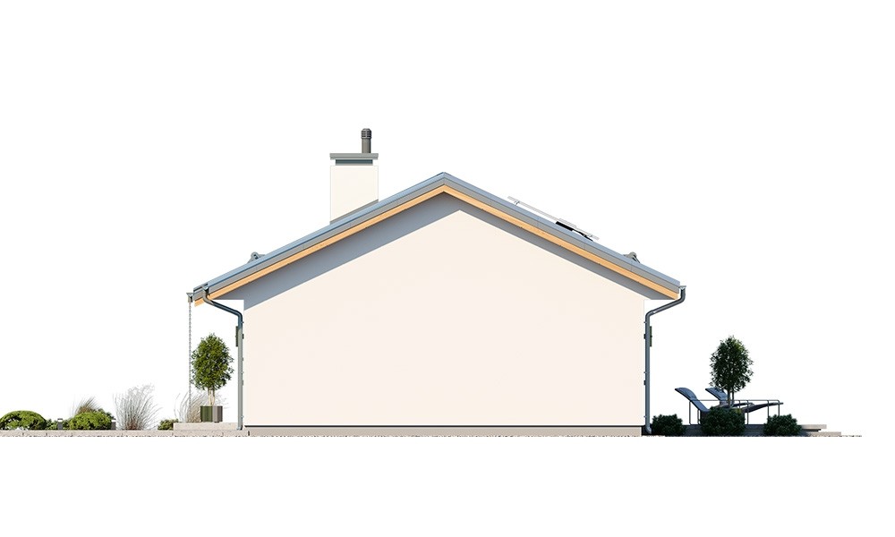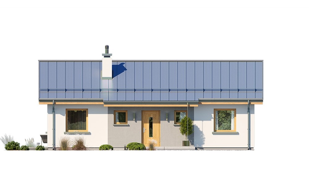 В экстерьере преобладают симметрия и правильные пропорции. Простые фасады венчаются двускатной кровлей с углом наклона в 25 градусов. Внутрь здания ведет элегантный вход, который отделяется контрастным цветом и оборудован площадкой под крышей. Планировка включает в себя три спальни, кухню-гостиную с камином, полноценную ванную комнату. Доминантой со стороны сада являются широкие балконные двери, которые позволяют попасть на открытую террасу.
