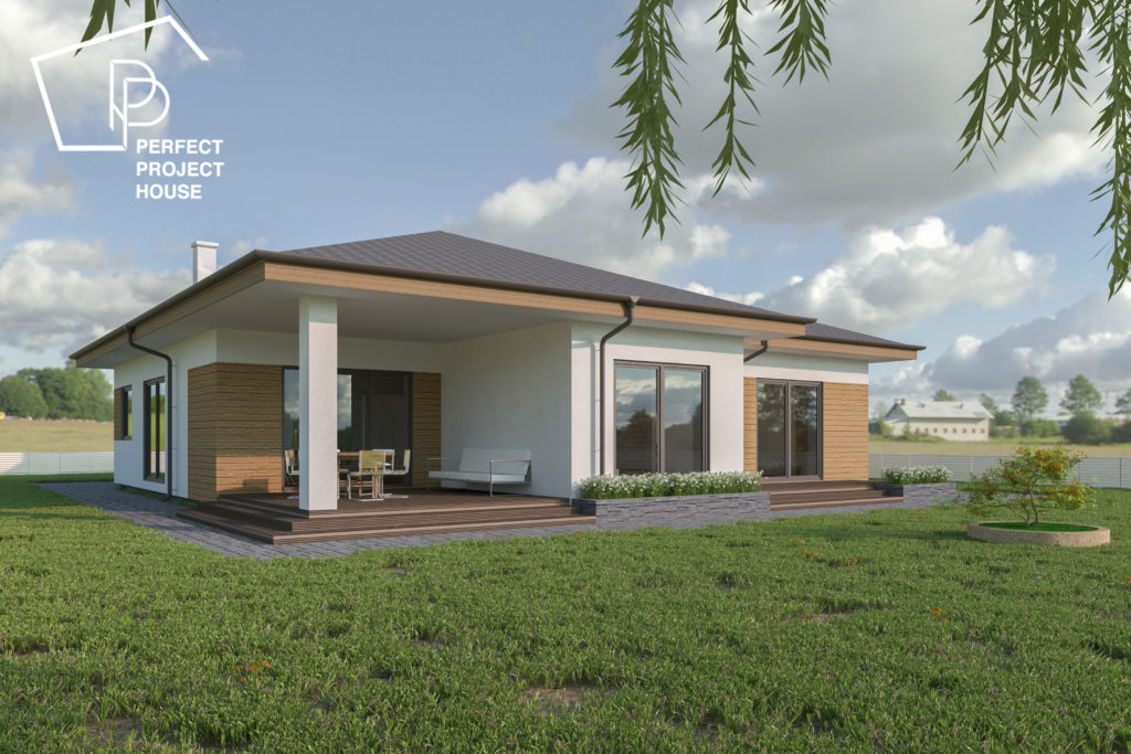 Проект одноэтажного дома рассчитан на комфортное проживание 5–6 человек. Площадь в 169 м2 позволяет уютно разместиться как всем членам семьи, так и гостям. Современная архитектура здания привлекает повышенное внимание. Фасады под дерево эффектно гармонируют с кровлей из черепицы и просторным навесом для размещения автомобиля. Внутри всё продумано до мельчайших деталей. В дневной зоне предусмотрены большая гостиная и отчасти закрытая кухня с выходом на террасы. В ночной зоне находятся 4 спальни, гардеробная, ванная комната, что обеспечивает высокий комфорт в проживании.